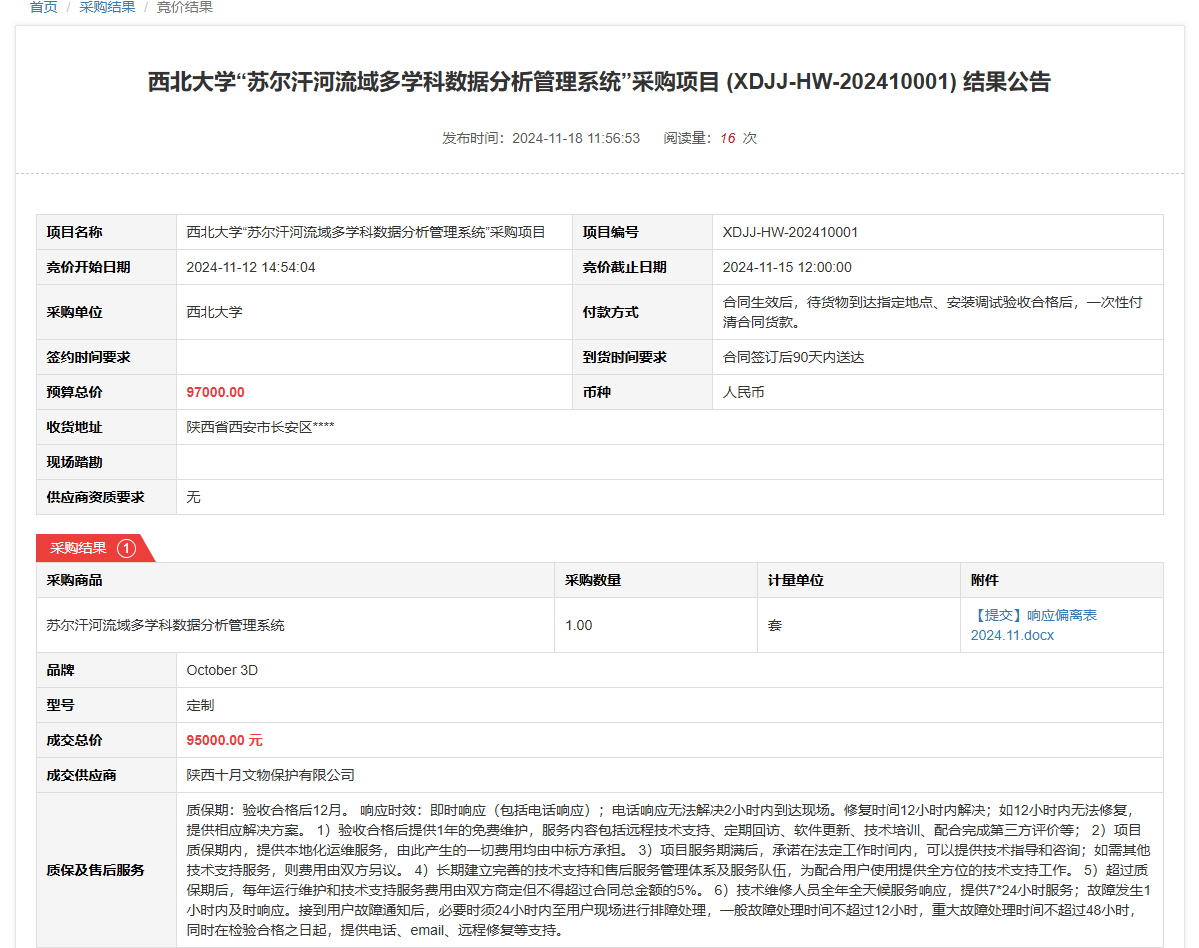 星空app官网“苏尔汗河流域多学科数据分析管理系统”采购项目(XDJJ-HW-202410001)竞价结果公告 作者:采购与招标办公室 编辑: 时间:2024-11-18 原公告链接:https://www.ejingcai.com.cn/site/bidding/detail/15008