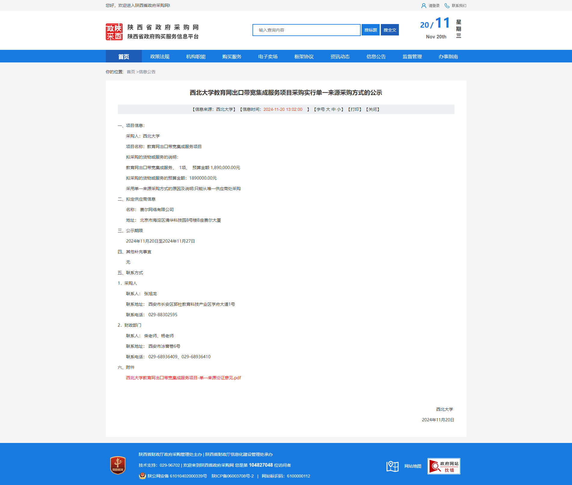 星空app官网教育网出口带宽集成服务项目采购实行单一来源采购方式的公示
