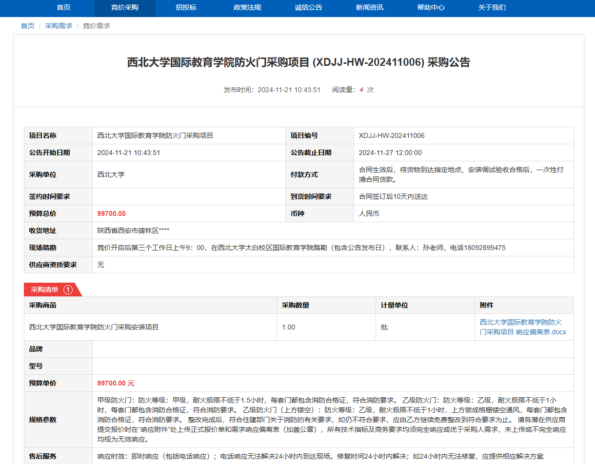 星空app官网国际教育学院防火门采购项目(XDJJ-HW-202411006)竞价采购公告 作者:采购与招标办公室 编辑: 时间:2024-11-21 原公告链接:https://www.ejingcai.com.cn/site/bidding/detail/15182