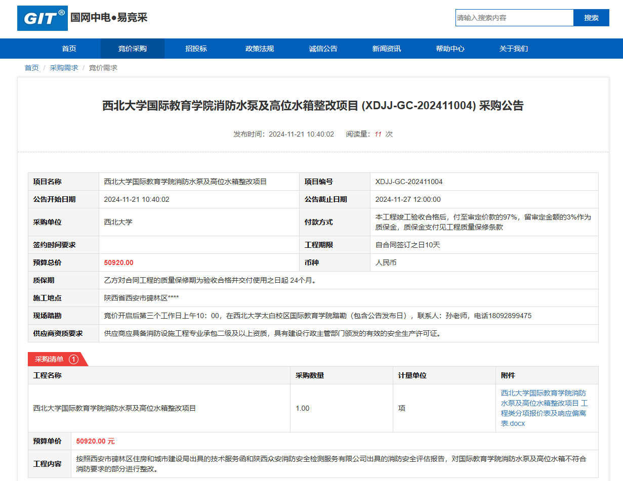 星空app官网国际教育学院消防水泵及高位水箱整改项目(XDJJ-GC-202411004)竞价采购公告 作者:采购与招标办公室 编辑: 时间:2024-11-21 原公告链接:https://www.ejingcai.com.cn/site/bidding/detail/15178
