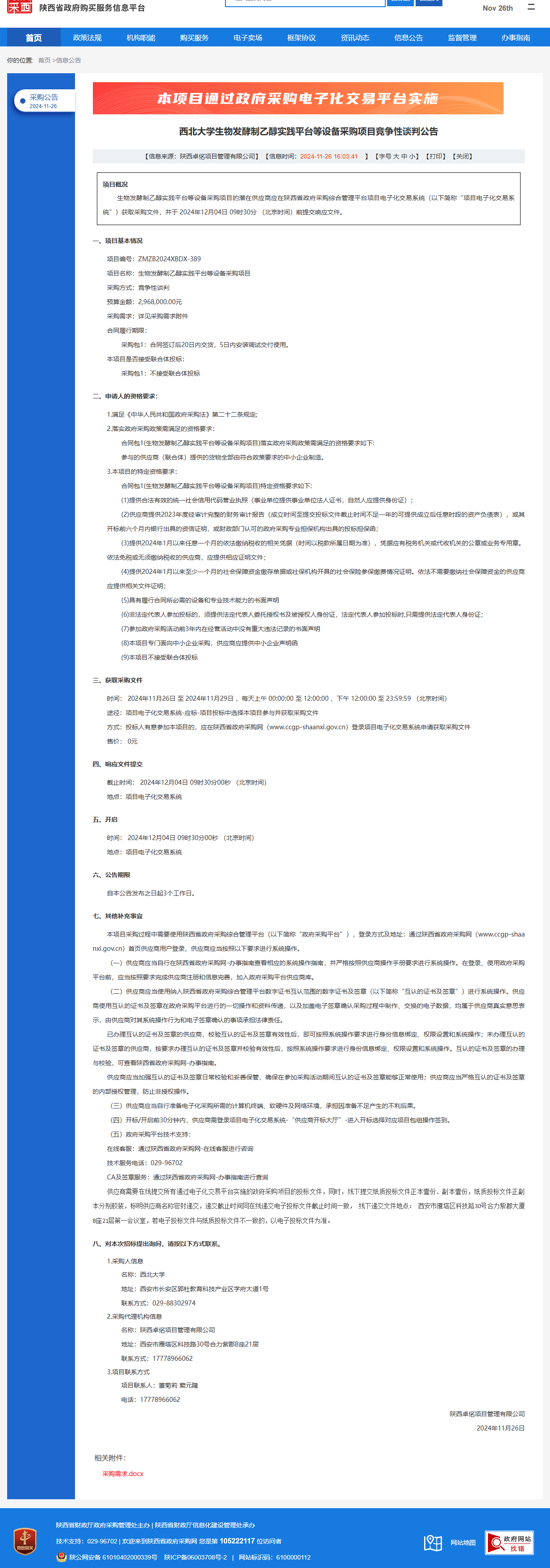 星空app官网生物发酵制乙醇实践平台等设备采购项目竞争性谈判公告 作者:采购与招标办公室 编辑: 时间:2024-11-26 原公告链接:https://www.ccgp-shaanxi.gov.cn/freecms/site/shaanxi/ggxx/info/2024/8a69c95d921859f0019365f6c5e47f67.html?noticeType=001013¬iceId=8a2ac2c3-abce-11ef-8063-08c0eb20c666