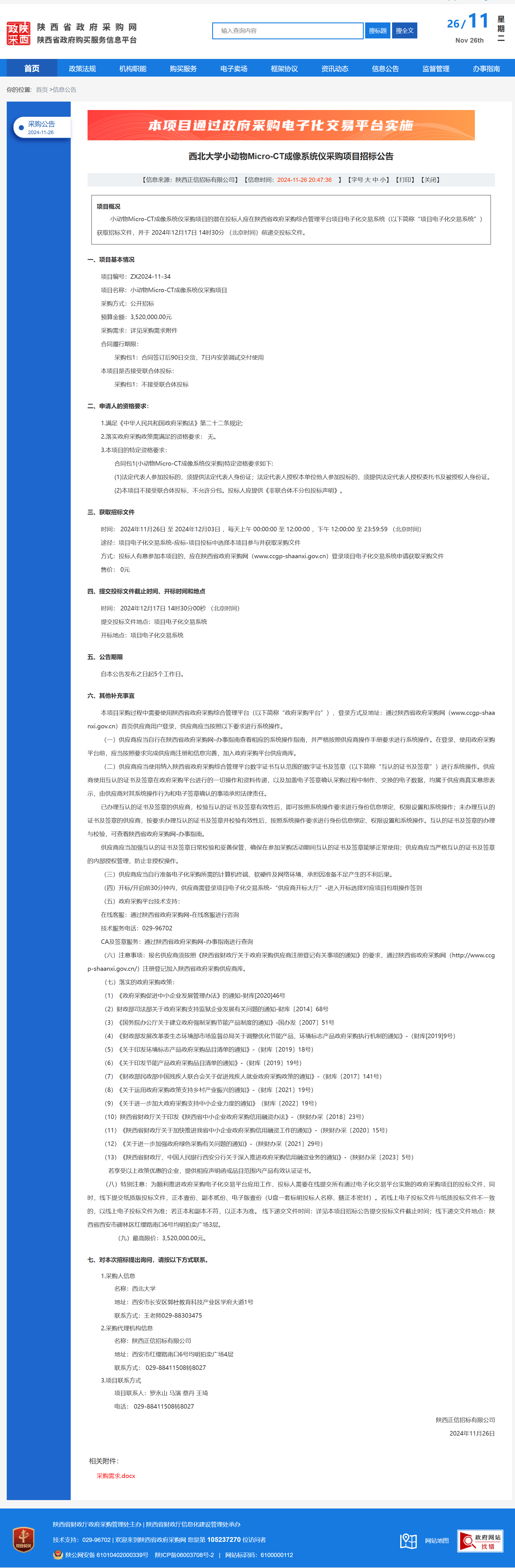 星空app官网小动物Micro-CT成像系统仪采购项目招标公告 作者:采购与招标办公室 编辑: 时间:2024-11-26 原公告链接:https://www.ccgp-shaanxi.gov.cn/freecms/site/shaanxi/ggxx/info/2024/8a69c251921857370193685963892947.html?noticeType=001011¬iceId=3436110f-abf6-11ef-8063-08c0eb20c666