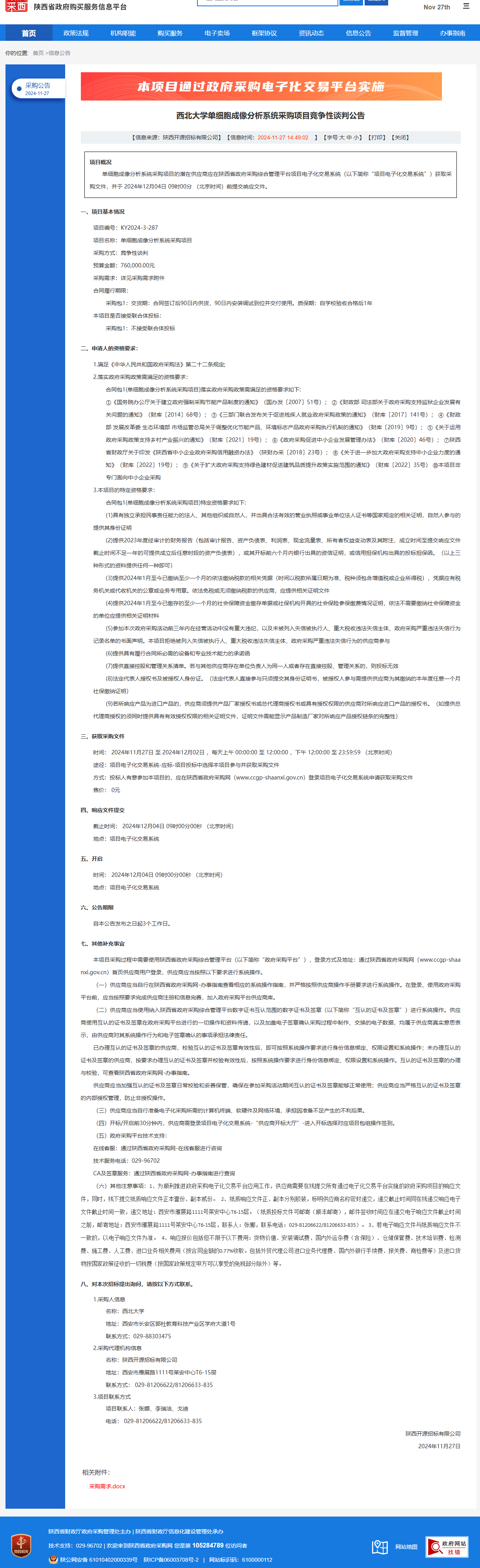星空app官网单细胞成像分析系统采购项目竞争性谈判公告 作者:采购与招标办公室 编辑: 时间:2024-11-27 原公告链接:https://www.ccgp-shaanxi.gov.cn/freecms/site/shaanxi/ggxx/info/2024/8a69c44e9218572b01936c491bb73b3e.html?noticeType=001013¬iceId=477c80ef-ac8d-11ef-8063-08c0eb20c666