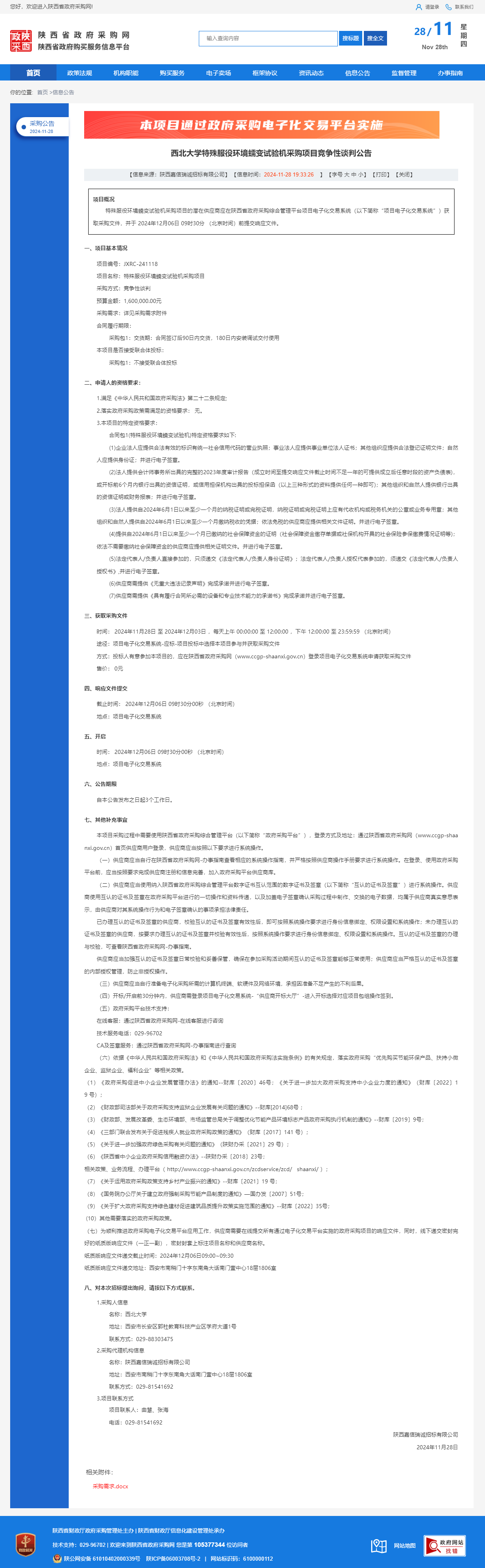 星空app官网特殊服役环境蠕变试验机采购项目竞争性谈判公告 作者:采购与招标办公室 编辑: 时间:2024-11-28 原公告链接:https://www.ccgp-shaanxi.gov.cn/freecms/site/shaanxi/ggxx/info/2024/8a69c251921857370193727b4a7b65d2.html?noticeType=001013¬iceId=2da54cc6-ad7e-11ef-8063-08c0eb20c666