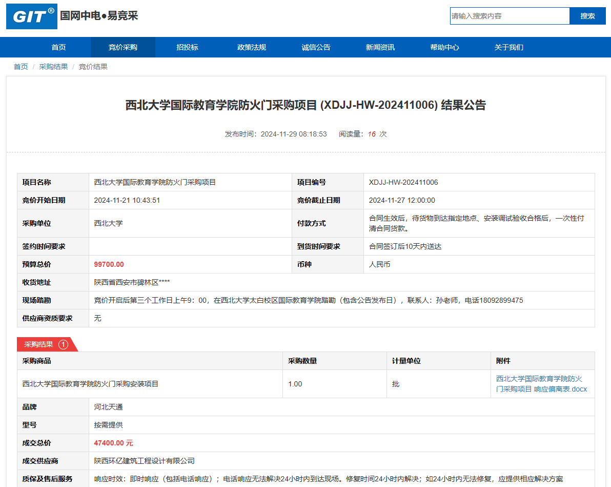 星空app官网国际教育学院防火门采购项目(XDJJ-HW-202411006)竞价结果公告 作者: 编辑: 时间:2024-11-29 原公告链接:https://www.ejingcai.com.cn/site/bidding/detail/15476