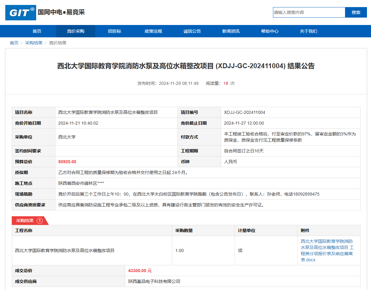 星空app官网国际教育学院消防水泵及高位水箱整改项目(XDJJ-GC-202411004)竞价结果公告 作者:采购与招标办公室 编辑: 时间:2024-11-29 原公告链接:https://www.ejingcai.com.cn/site/bidding/detail/15475