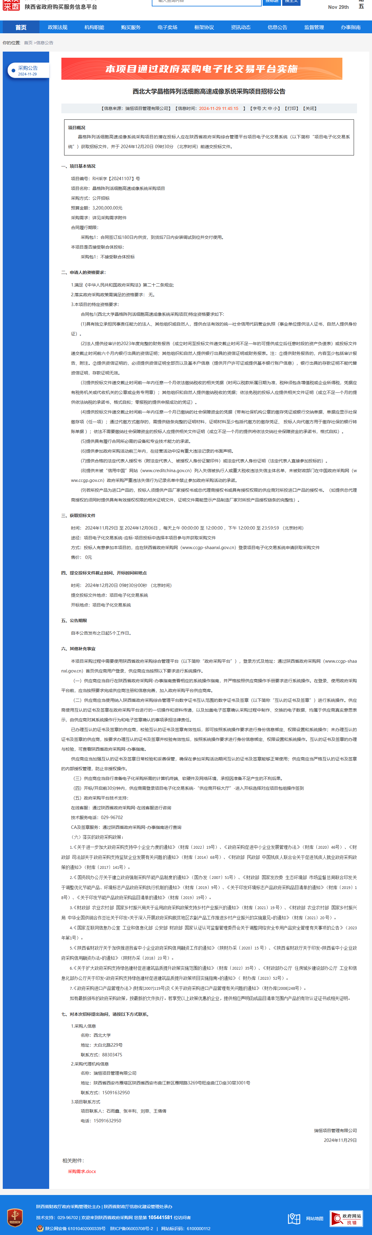 星空app官网晶格阵列活细胞高速成像系统采购项目招标公告 作者:采购与招标办公室 编辑: 时间:2024-11-29 原公告链接:https://www.ccgp-shaanxi.gov.cn/freecms/site/shaanxi/ggxx/info/2024/8a69c5a59218576d019375dfd49370a6.html?noticeType=001011¬iceId=f0ae5699-ae05-11ef-8063-08c0eb20c666