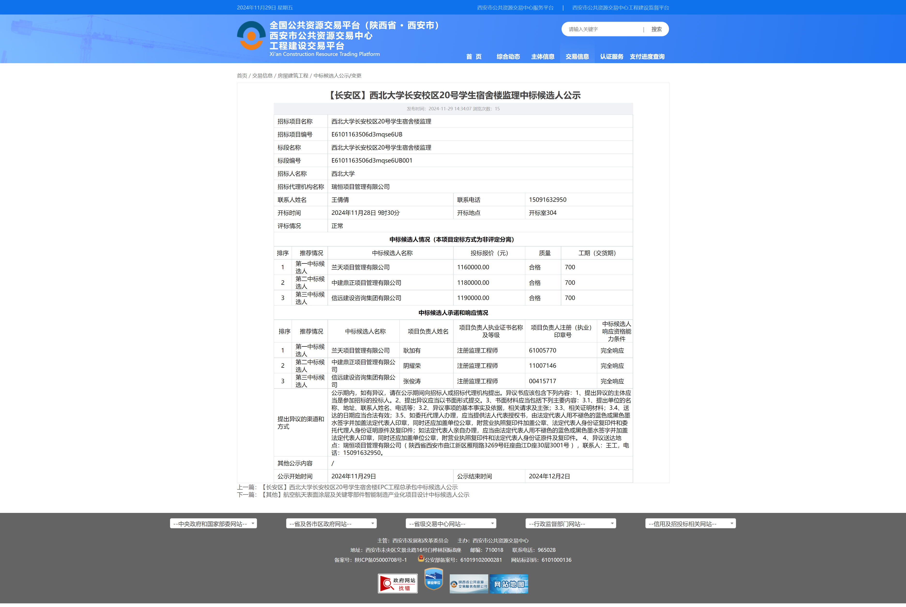 星空app官网长安校区20号学生宿舍楼监理中标候选人公示