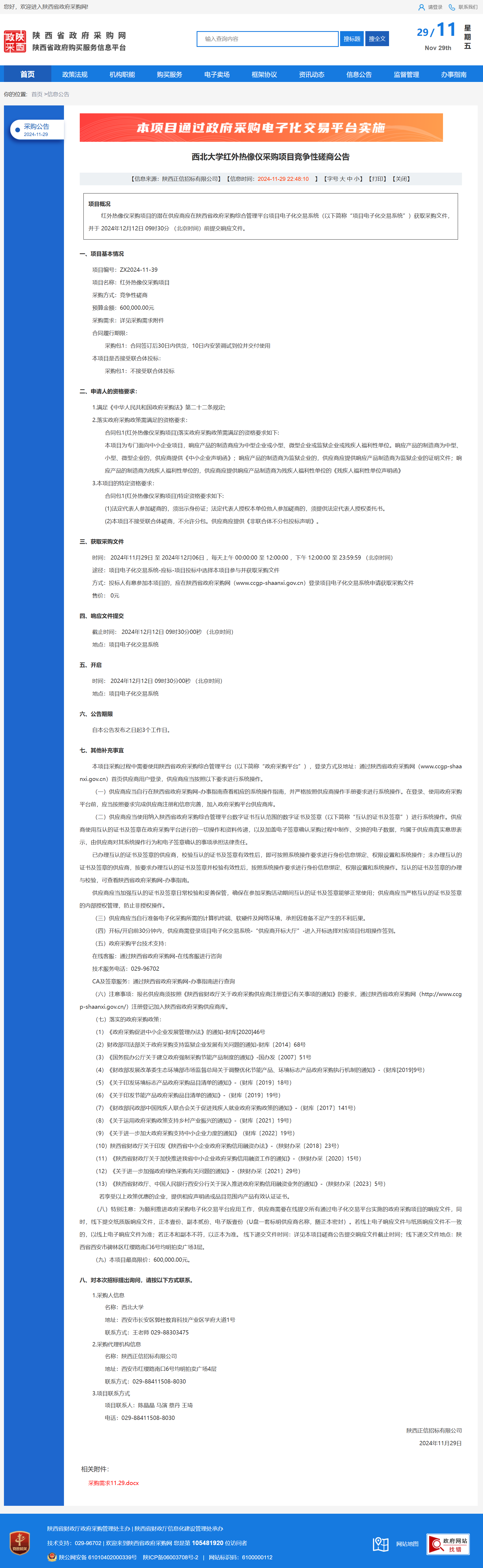 星空app官网红外热像仪采购项目竞争性磋商公告 作者:采购与招标办公室 编辑: 时间:2024-11-29 原公告链接:http://www.ccgp-shaanxi.gov.cn/freecms/site/shaanxi/ggxx/info/2024/8a69c25192185737019378563f514743.html?noticeType=001016¬iceId=8c82e43c-ae62-11ef-8063-08c0eb20c666