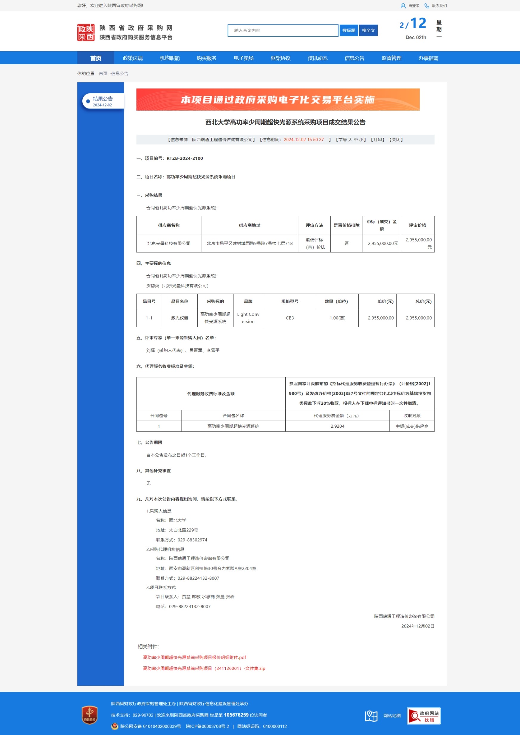 星空app官网高功率少周期超快光源系统采购项目成交结果公告 作者: 编辑:薛利娟 时间:2024-12-02 原公告链接:https://www.ccgp-shaanxi.gov.cn/freecms/site/shaanxi/ggxx/info/2024/8a69c2519218573701938649d42c03eb.html?noticeType=001025¬iceId=b85354c1-b083-11ef-8063-08c0eb20c666