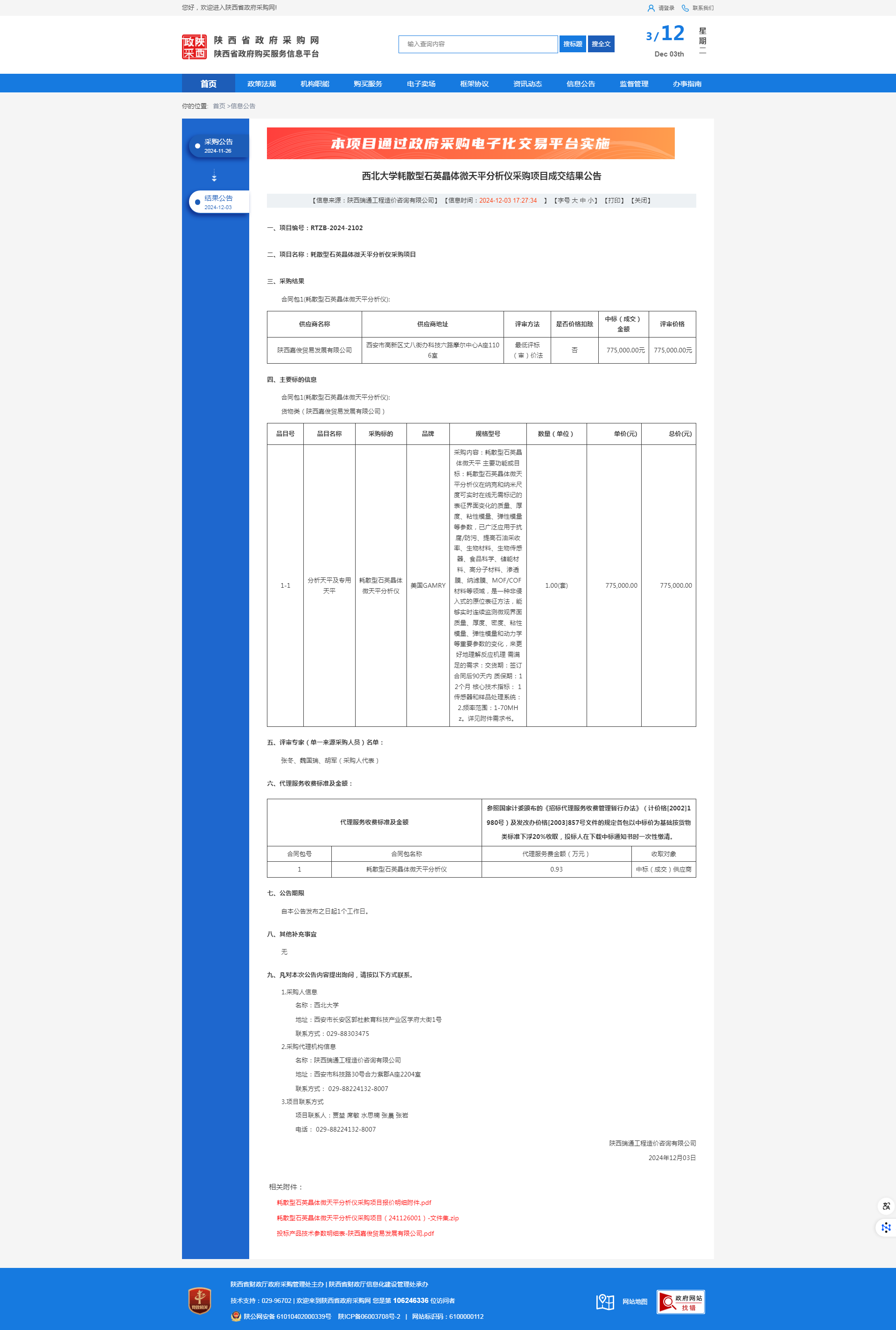 星空app官网耗散型石英晶体微天平分析仪采购项目成交结果公告 作者:采购与招标办公室 编辑: 时间:2024-12-03 原公告链接:https://www.ccgp-shaanxi.gov.cn/freecms/site/shaanxi/ggxx/info/2024/8a69c2519218573701938bc3ac1a16c6.html?noticeType=001023¬iceId=6e7b31eb-b15a-11ef-8063-08c0eb20c666