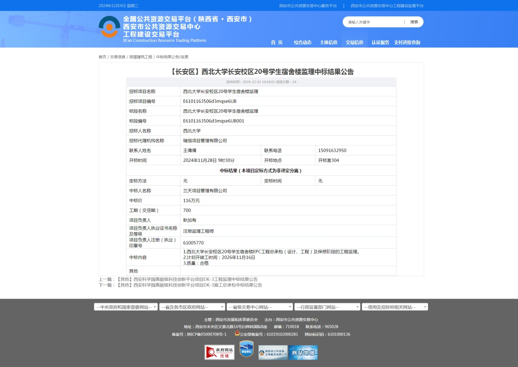 星空app官网长安校区20号学生宿舍楼监理中标结果公告
