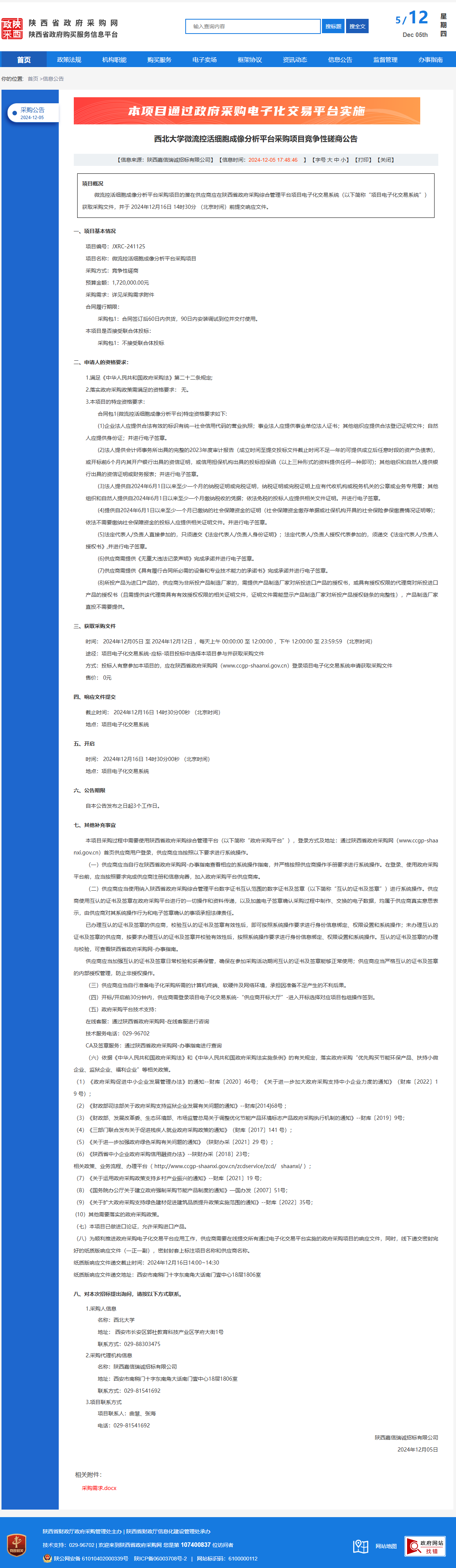 星空app官网微流控活细胞成像分析平台采购项目竞争性磋商公告 作者:采购与招标办公室 编辑: 时间:2024-12-05 原公告链接:https://www.ccgp-shaanxi.gov.cn/freecms/site/shaanxi/ggxx/info/2024/8a69c5a59218576d0193962b8b5f7d27.html?noticeType=001016¬iceId=ba5283be-b2ef-11ef-8063-08c0eb20c666