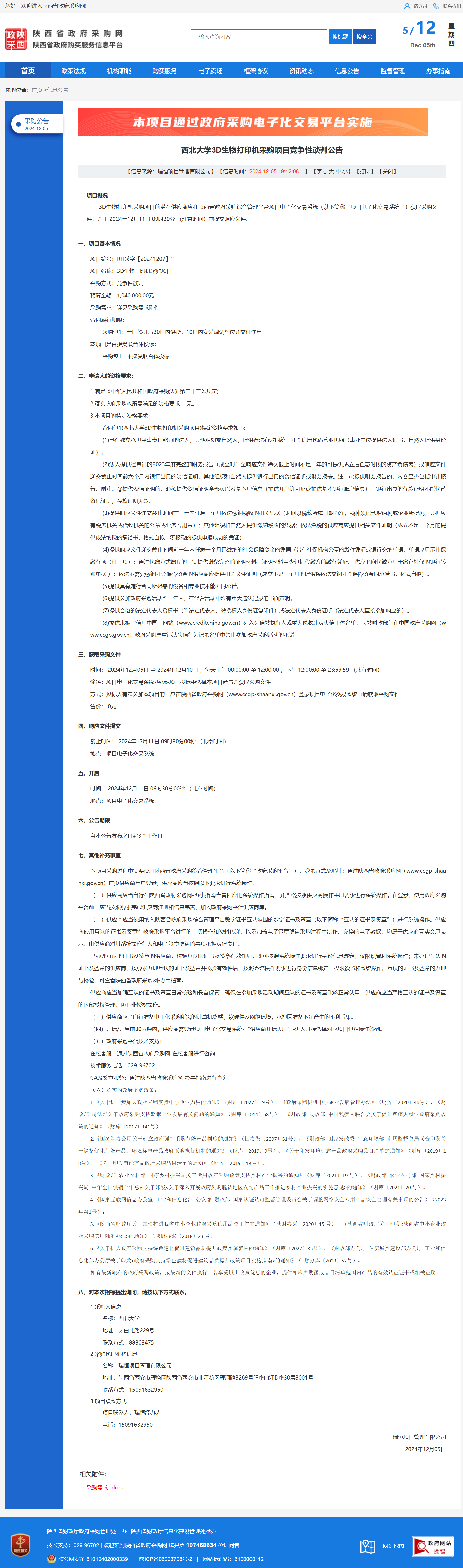星空app官网3D生物打印机采购项目竞争性谈判公告 作者:采购与招标办公室 编辑: 时间:2024-12-05 原公告链接:http://www.ccgp-shaanxi.gov.cn/freecms/site/shaanxi/ggxx/info/2024/8a69c95d921859f001939679368a3d50.html?noticeType=001013¬iceId=5fb3a087-b2fb-11ef-8063-08c0eb20c666