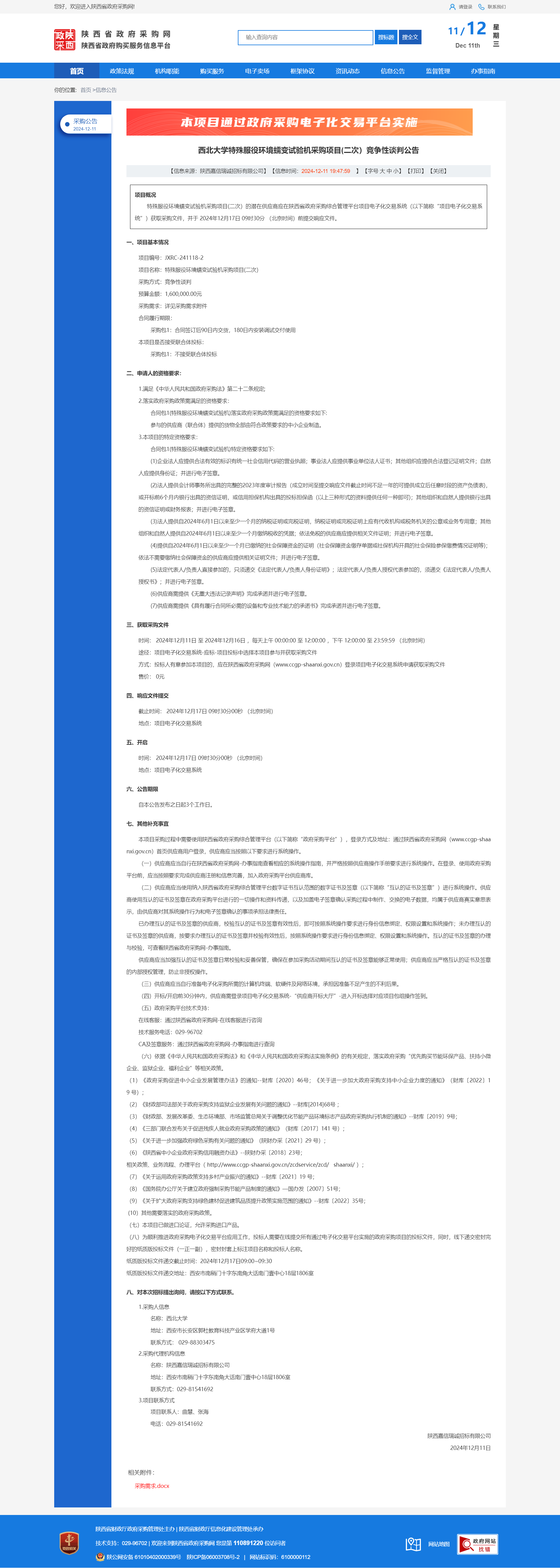 星空app官网特殊服役环境蠕变试验机采购项目(二次)竞争性谈判公告 作者:采购与招标办公室 编辑: 时间:2024-12-11 原公告链接:https://www.ccgp-shaanxi.gov.cn/freecms/site/shaanxi/ggxx/info/2024/8a69c5a59218576d0193b572f0492761.html?noticeType=001013¬iceId=632dd20f-b7b7-11ef-8063-08c0eb20c666