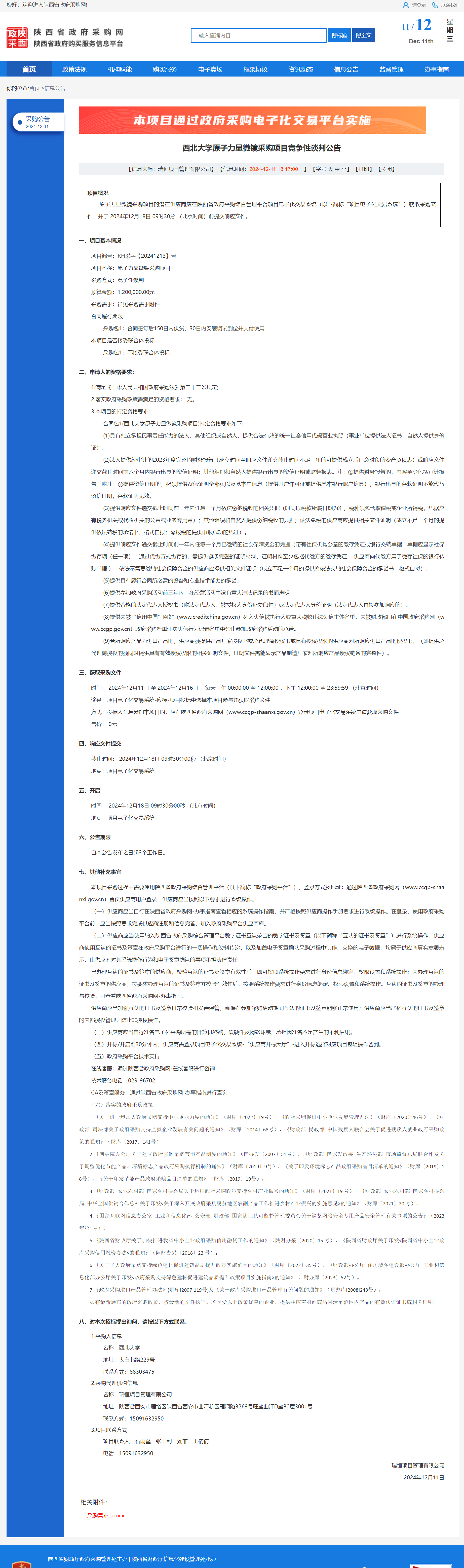 星空app官网原子力显微镜采购项目竞争性谈判公告 作者:采购与招标办公室 编辑: 时间:2024-12-11 原公告链接:http://www.ccgp-shaanxi.gov.cn/freecms/site/shaanxi/ggxx/info/2024/8a69c251921857370193b52d521644e4.html?noticeType=001013¬iceId=ad5ee099-b7aa-11ef-8063-08c0eb20c666