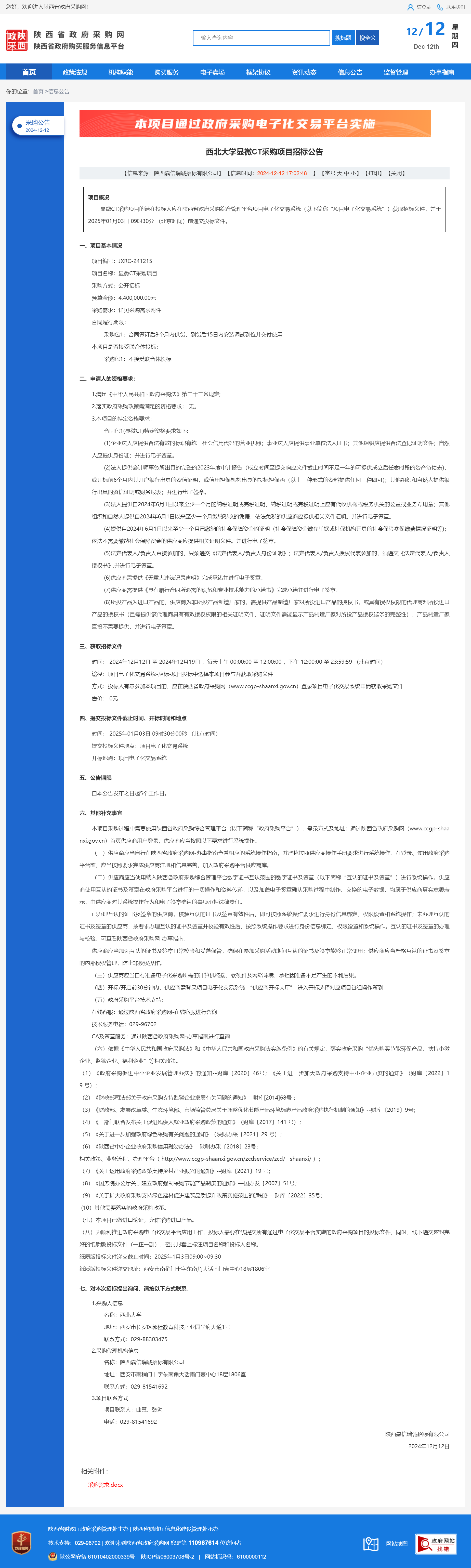 星空app官网显微CT采购项目招标公告 作者:采购与招标办公室 编辑: 时间:2024-12-12 原公告链接:https://www.ccgp-shaanxi.gov.cn/freecms/site/shaanxi/ggxx/info/2024/8a69c5a59218576d0193ba1292507a9d.html?noticeType=001011¬iceId=7add7000-b869-11ef-8063-08c0eb20c666