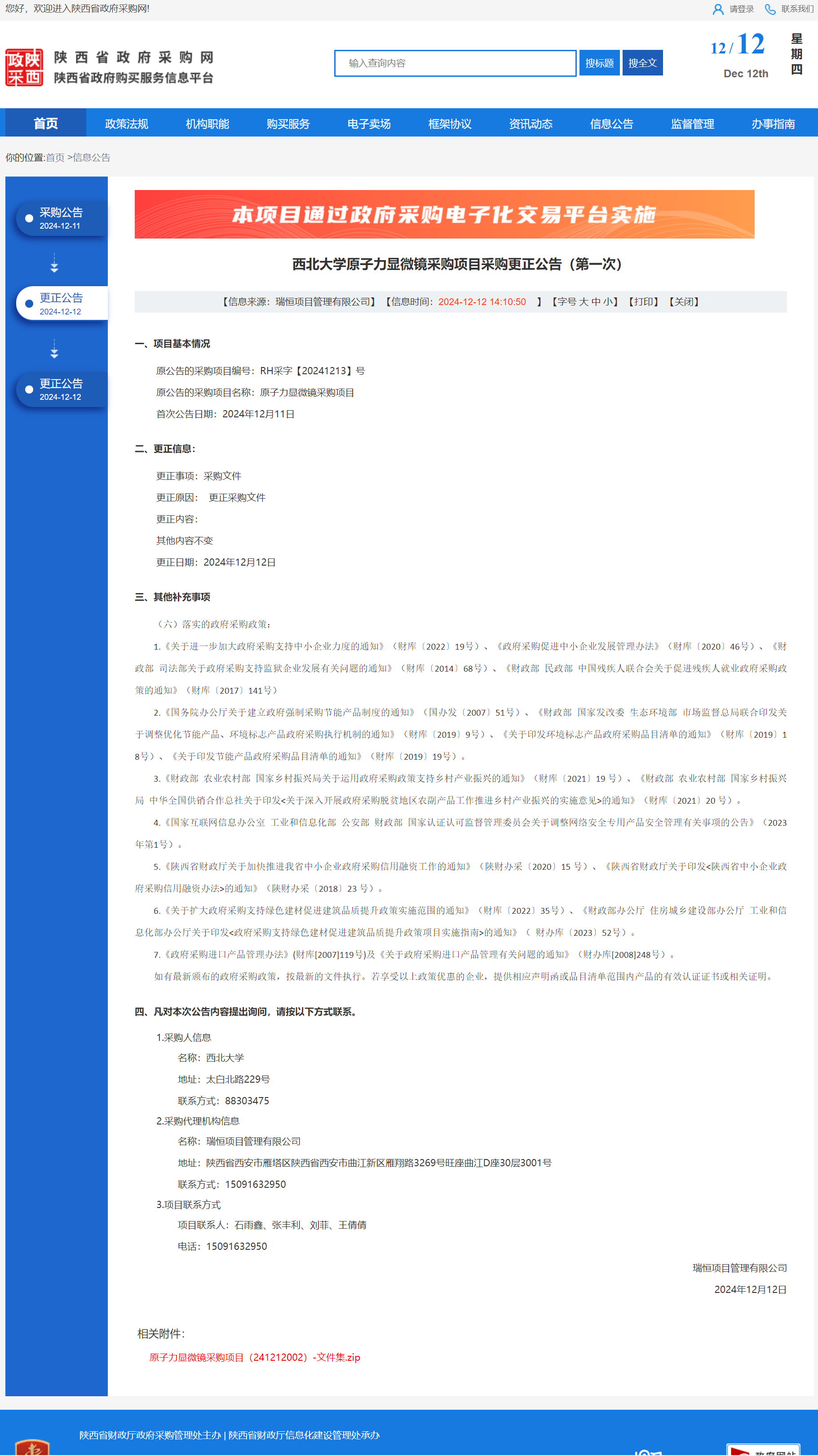 星空app官网原子力显微镜采购项目采购更正公告(第一次) 作者:采购与招标办公室 编辑: 时间:2024-12-12 原公告链接:https://www.ccgp-shaanxi.gov.cn/freecms/site/shaanxi/ggxx/info/2024/8a69c5a59218576d0193ba3c419e1460.html?noticeType=001031¬iceId=bbffc791-b86e-11ef-8063-08c0eb20c666