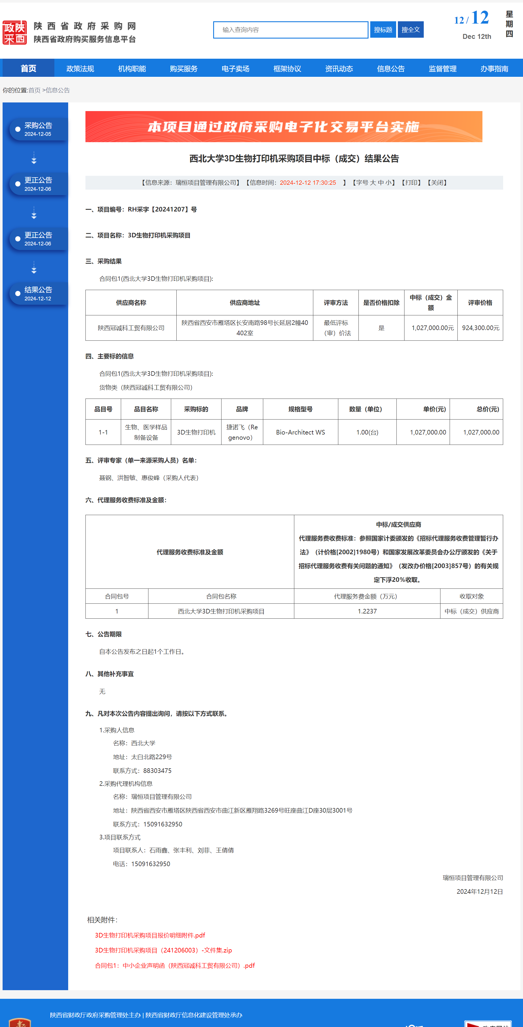 星空app官网3D生物打印机采购项目中标(成交)结果公告 作者:采购与招标办公室 编辑: 时间:2024-12-12 原公告链接:https://www.ccgp-shaanxi.gov.cn/freecms/site/shaanxi/ggxx/info/2024/8a69c95d921859f00193ba2d4fab4cb1.html