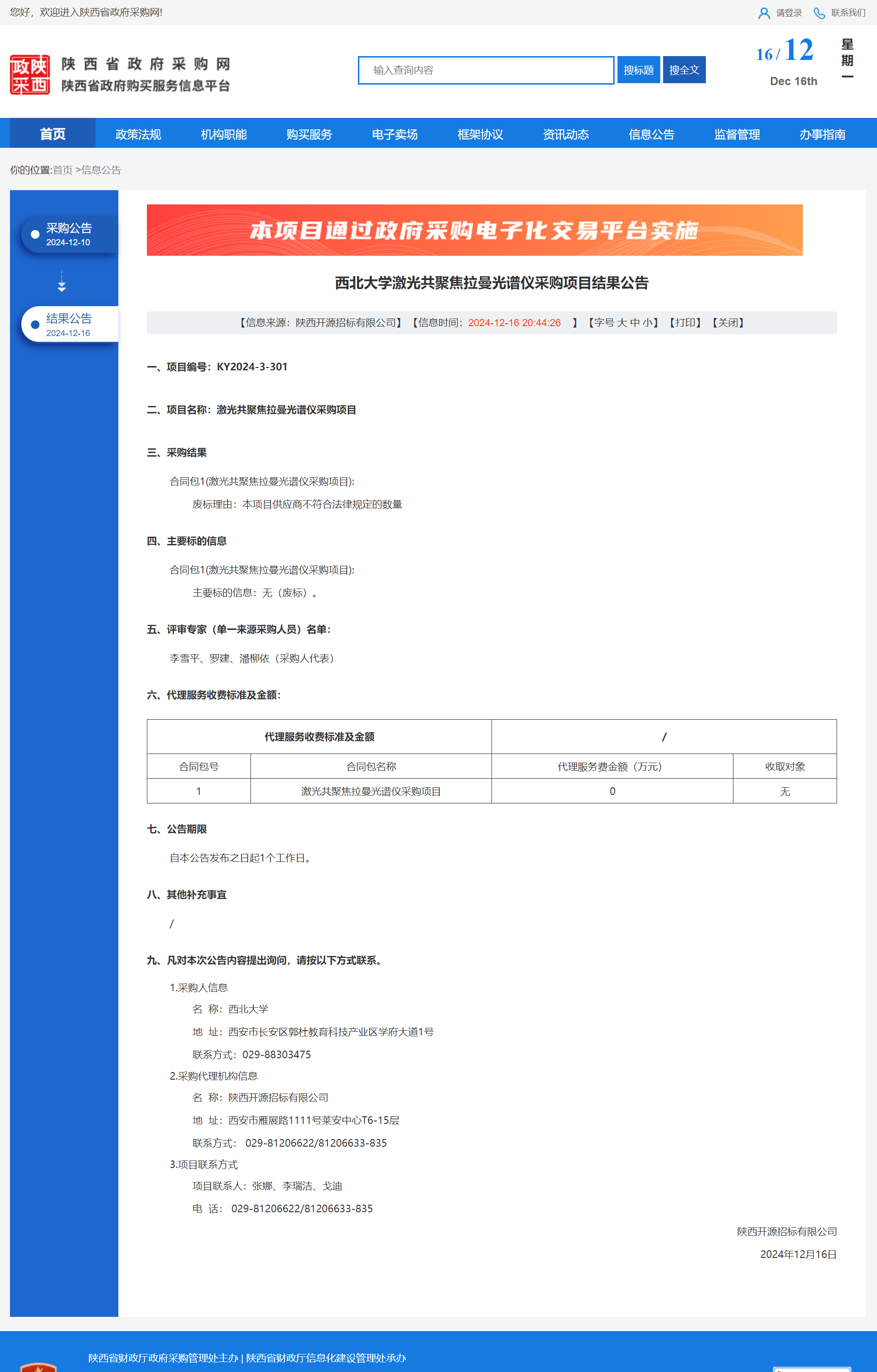 星空app官网激光共聚焦拉曼光谱仪采购项目结果公告 作者:采购与招标办公室 编辑: 时间:2024-12-16 原公告链接:https://www.ccgp-shaanxi.gov.cn/freecms/site/shaanxi/ggxx/info/2024/8a69c5a59218576d0193cf7935a32c29.html?noticeType=001006¬iceId=1c92edd7-bbad-11ef-8063-08c0eb20c666