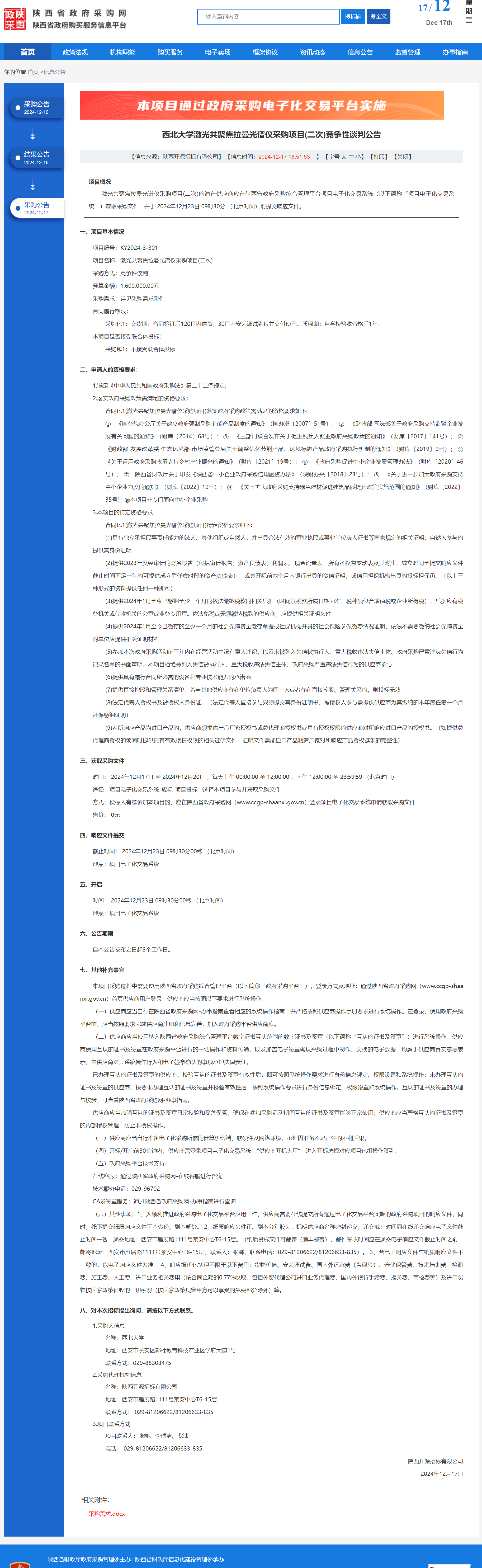 星空app官网激光共聚焦拉曼光谱仪采购项目(二次)竞争性谈判公告 作者:采购与招标办公室 编辑: 时间:2024-12-17 原公告链接:https://www.ccgp-shaanxi.gov.cn/freecms/site/shaanxi/ggxx/info/2024/8a69c44e9218572b0193d434f6c730a9.html?noticeType=001013¬iceId=8ed4237e-bc66-11ef-8063-08c0eb20c666