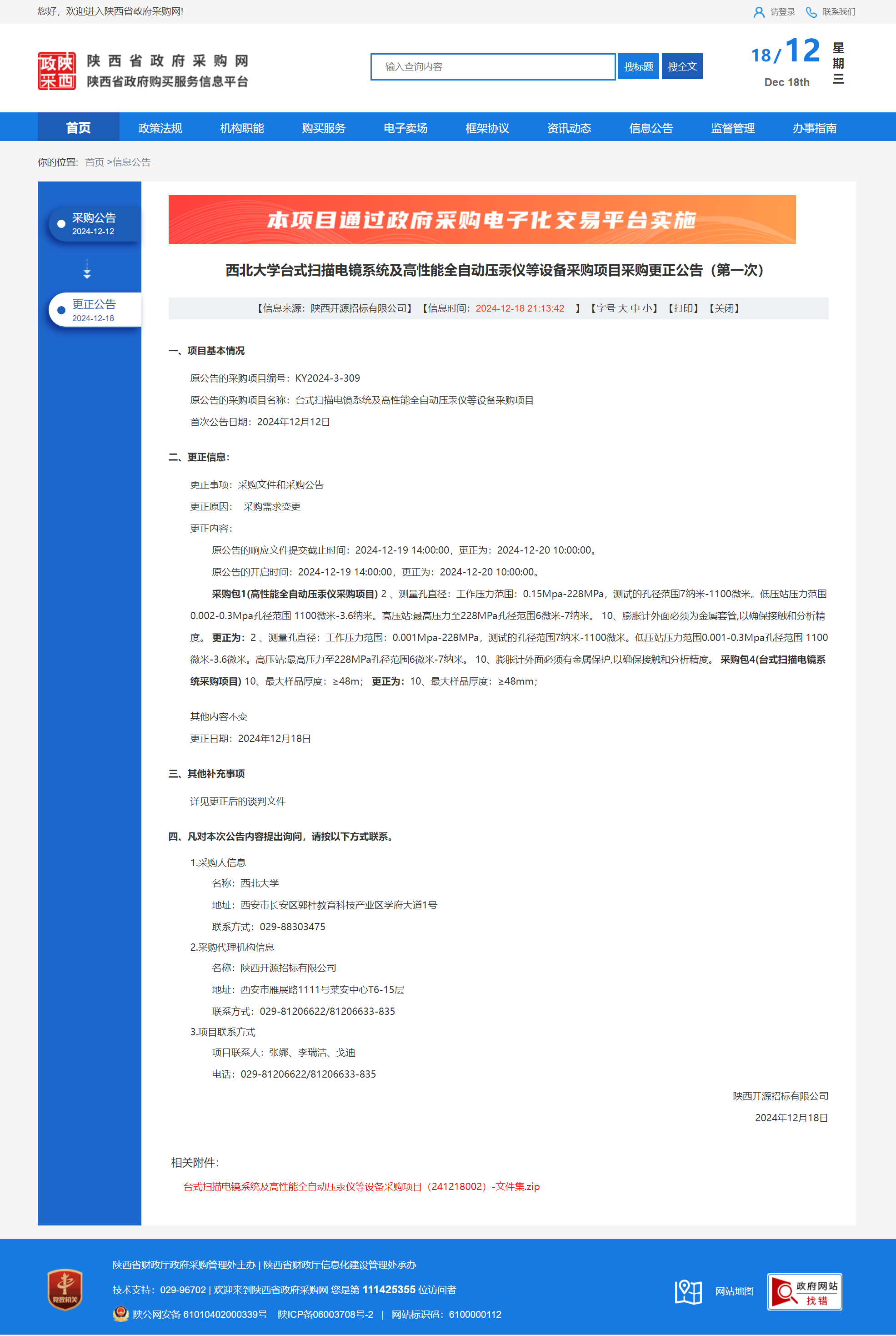 星空app官网台式扫描电镜系统及高性能全自动压汞仪等设备采购项目采购更正公告(第一次)