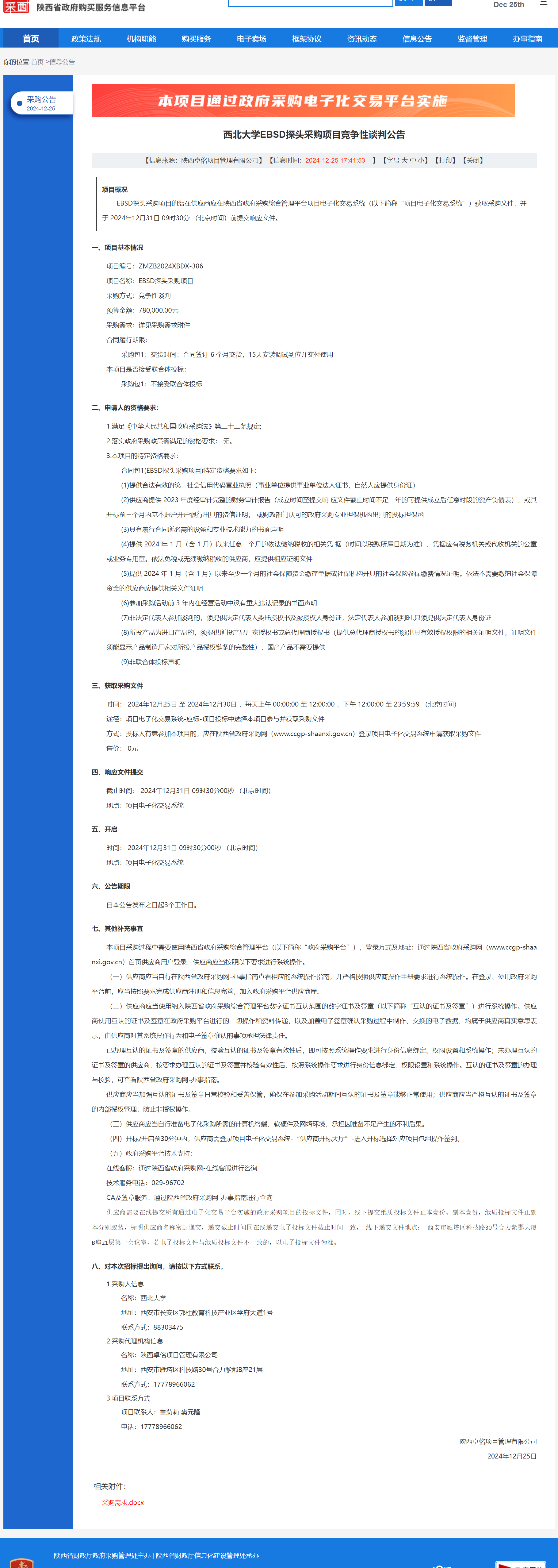 星空app官网EBSD探头采购项目竞争性谈判公告 作者:采购与招标办公室 编辑: 时间:2024-12-25 原公告链接:https://www.ccgp-shaanxi.gov.cn/freecms/site/shaanxi/ggxx/info/2024/8a69c251921857370193fd2ded71224e.html?noticeType=001013¬iceId=1e749fa7-c2a6-11ef-8063-08c0eb20c666