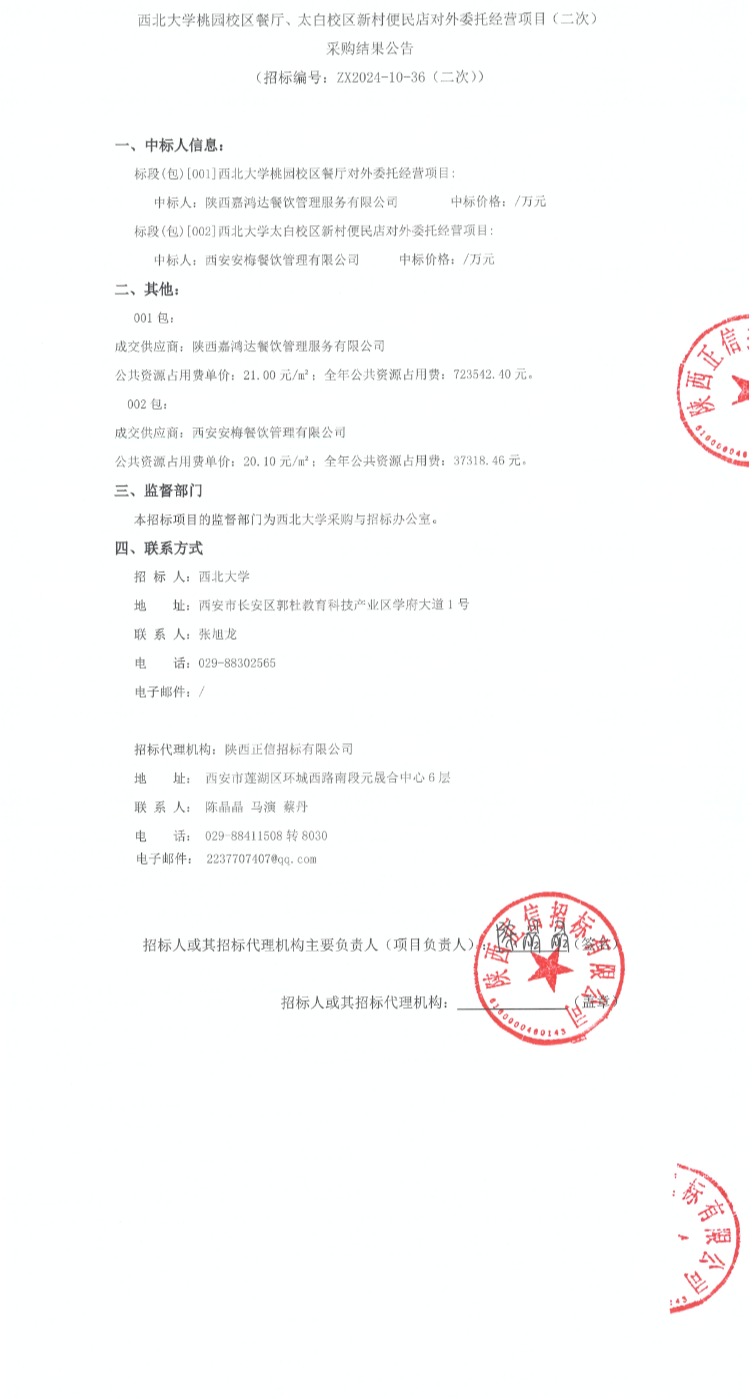 星空app官网桃园校区餐厅、太白校区新村便民店对外委托经营项目(二次)采购结果公告