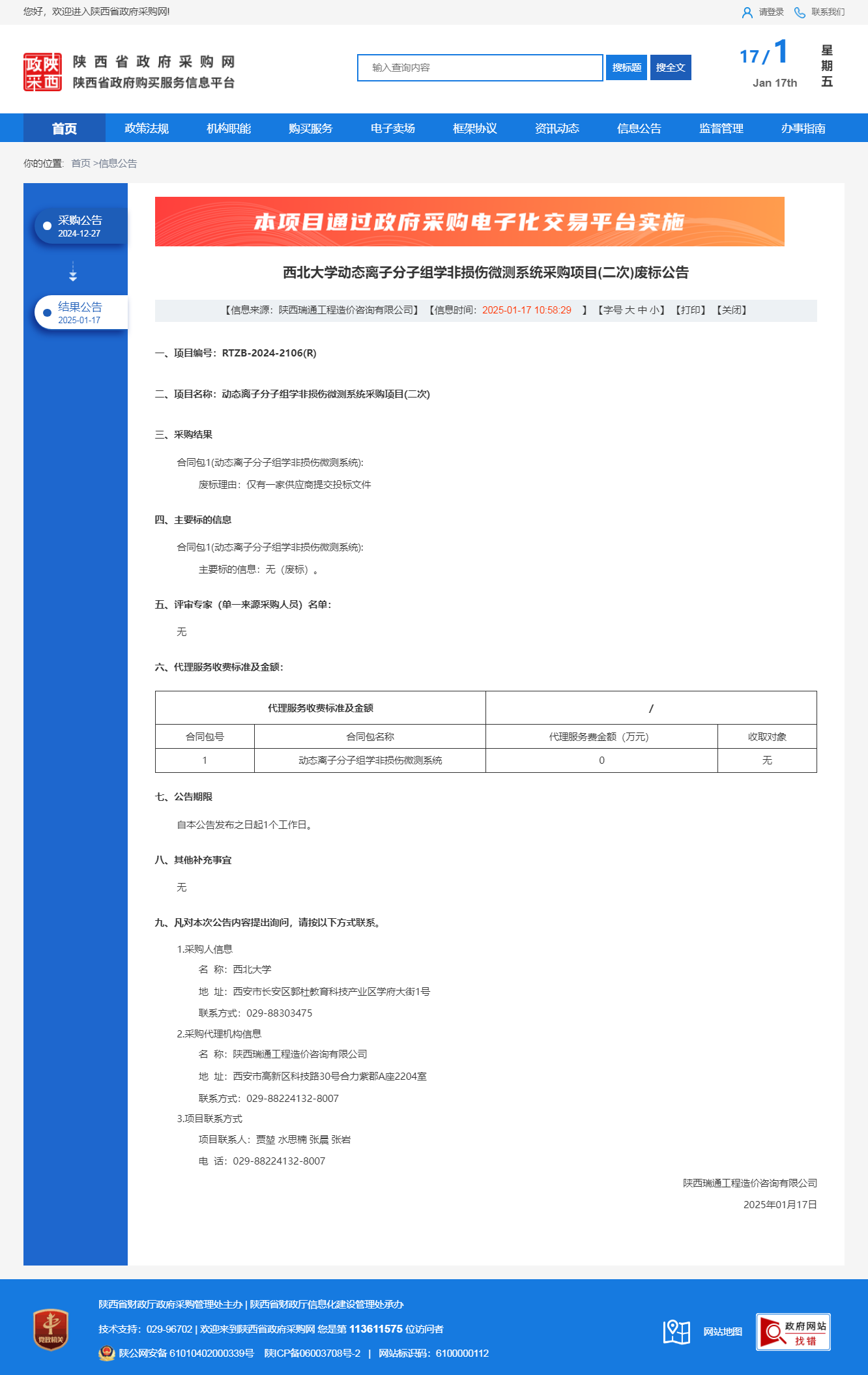 星空app官网动态离子分子组学非损伤微测系统采购项目(二次)废标公告 作者:采购与招标办公室 编辑: 时间:2025-01-17 原公告链接:http://www.ccgp-shaanxi.gov.cn/freecms/site/shaanxi/ggxx/info/2025/8a69c96e945549bc0194722b08d821b5.html?noticeType=001006¬iceId=9dc5fb96-d480-11ef-8063-08c0eb20c666