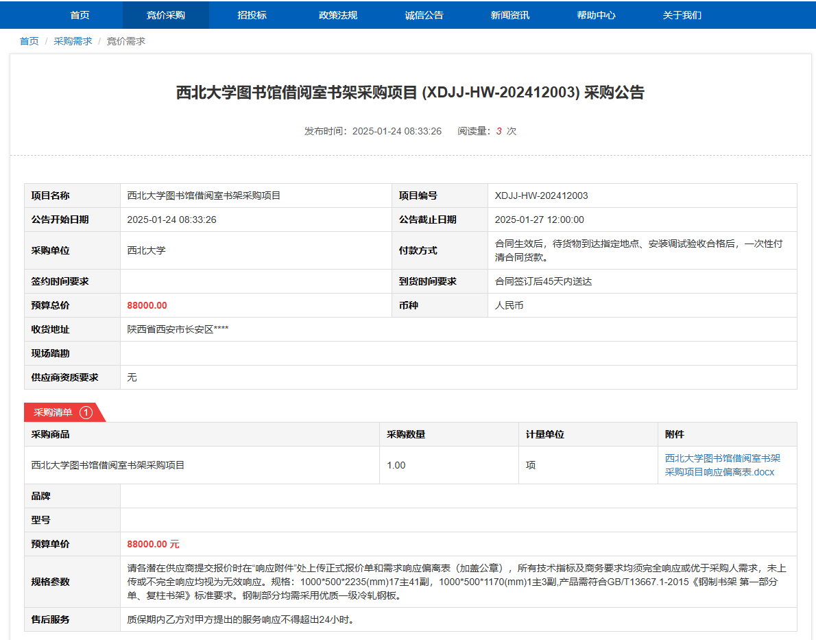 星空app官网图书馆借阅室书架采购项目 (XDJJ-HW-202412003) 采购公告 作者:采购与招标办公室 编辑: 时间:2025-01-24 原公告链接:https://www.ejingcai.com.cn/site/bidding/detail/16453
