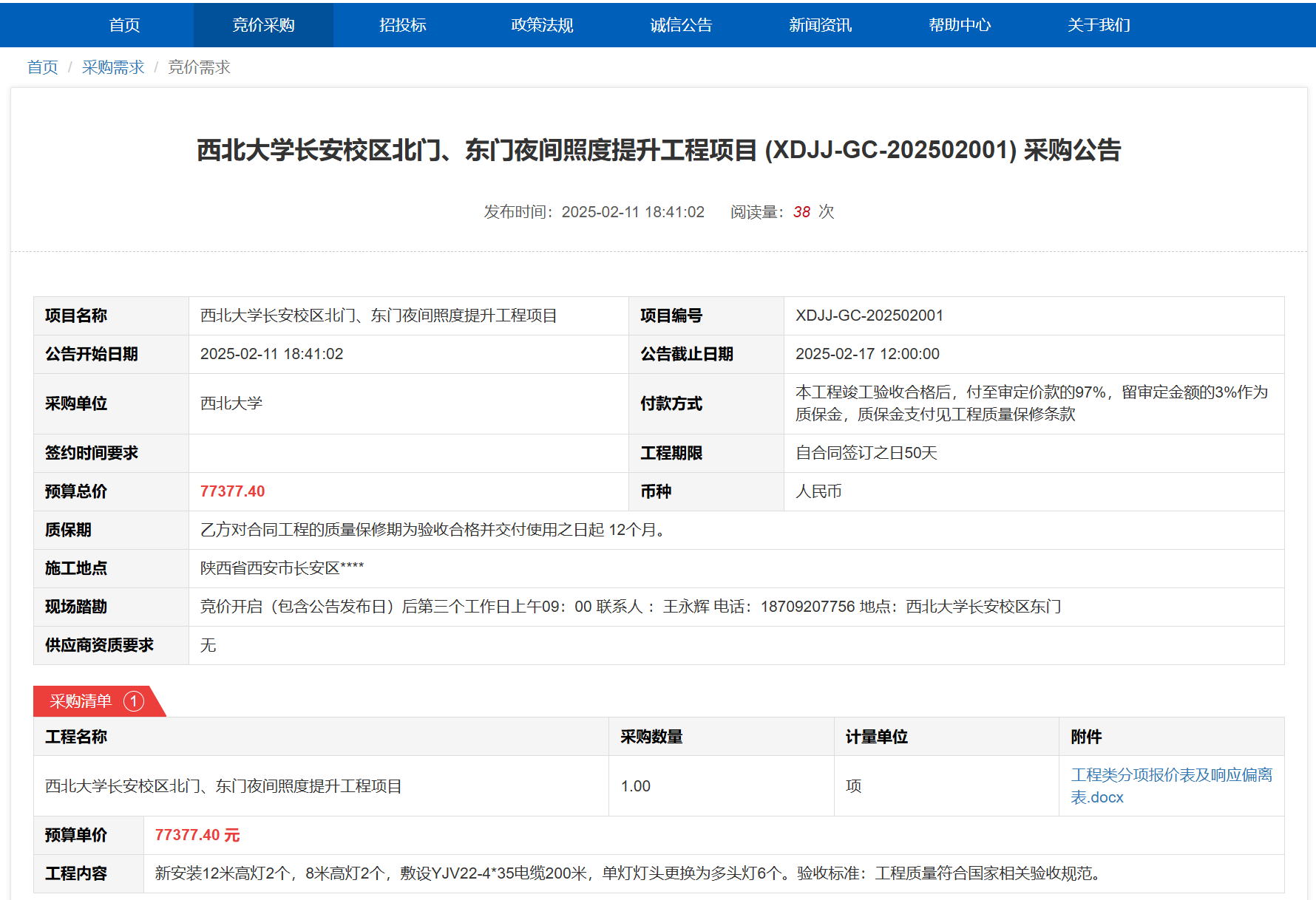 星空app官网长安校区北门、东门夜间照度提升工程项目(XDJJ-GC-202502001)竞价采购公告 作者:采购与招标办公室 编辑: 时间:2025-02-11 原公告链接:https://www.ejingcai.com.cn/site/bidding/detail/16497