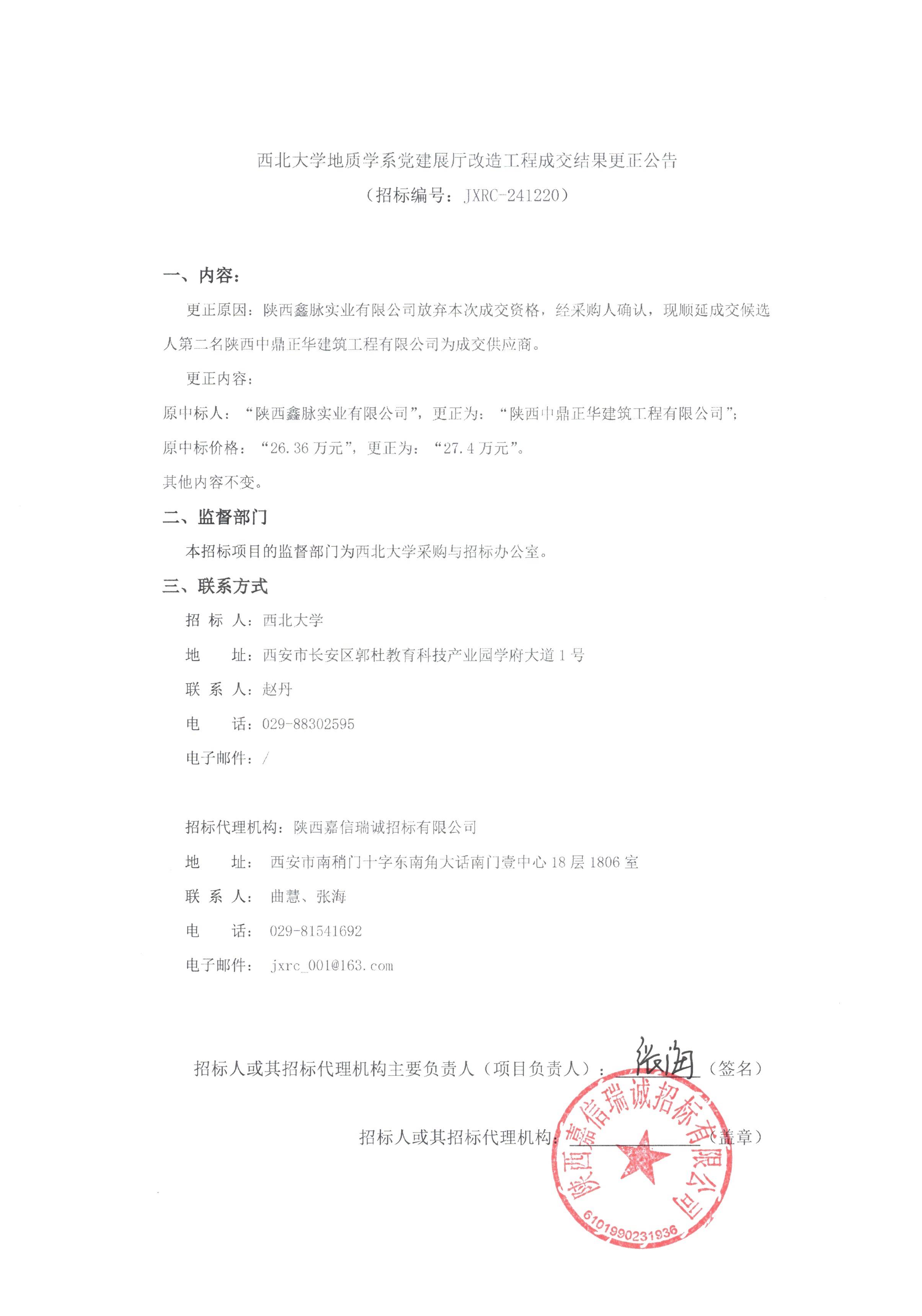 星空app官网地质学系党建展厅改造工程成交结果更正公告