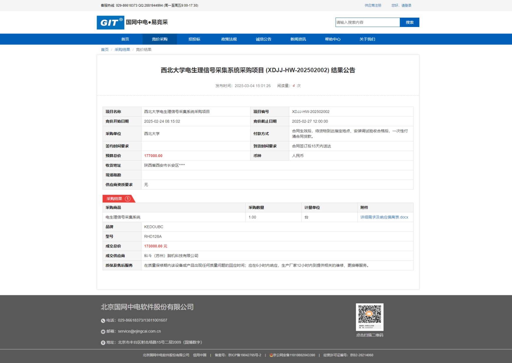 星空app官网电生理信号采集系统采购项目 (XDJJ-HW-202502002) 竞价结果公告 作者: 编辑:采购与招标办公室 时间:2025-03-04 原公告链接:https://www.ejingcai.com.cn/site/bidding/detail/16713