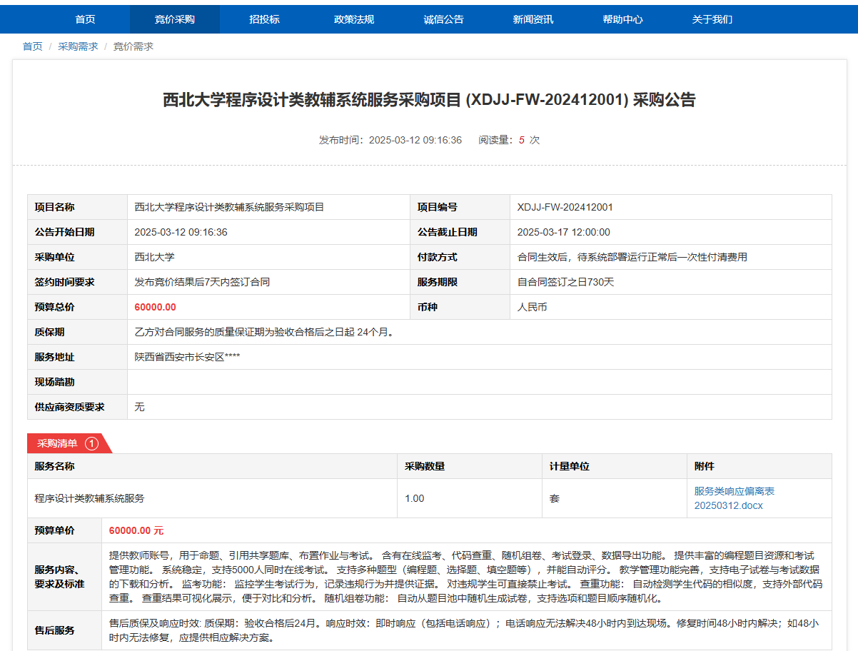 星空app官网程序设计类教辅系统服务采购项目(XDJJ-FW-202412001)竞价采购公告 作者:采购与招标办公室 编辑: 时间:2025-03-12 原公告链接:https://www.ejingcai.com.cn/site/bidding/detail/16888