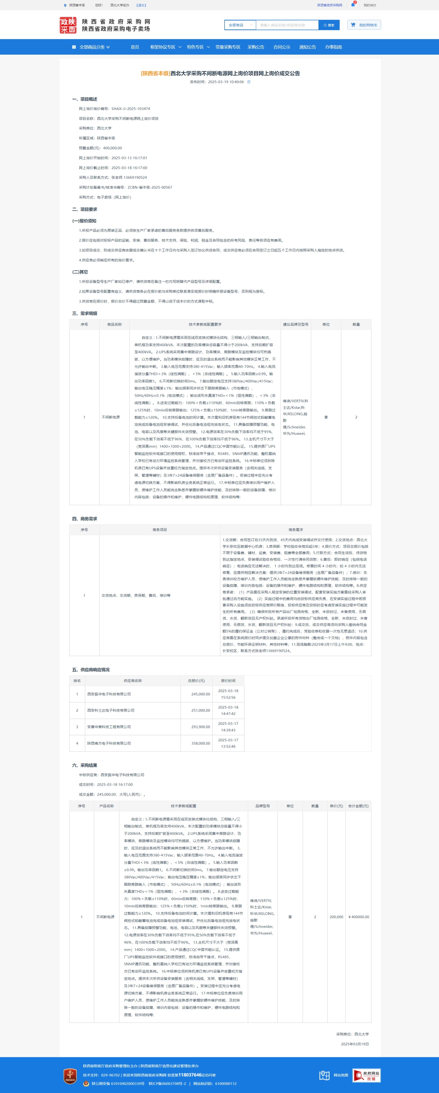星空app官网采购不间断电源网上询价项目网上询价成交公告 作者: 编辑:采购与招标办公室 时间:2025-03-19 原公告链接:https://www.ccgp-shaanxi.gov.cn/gpmall-main-web/basic/noticeDetail?noticeGuid=7301336059869331456