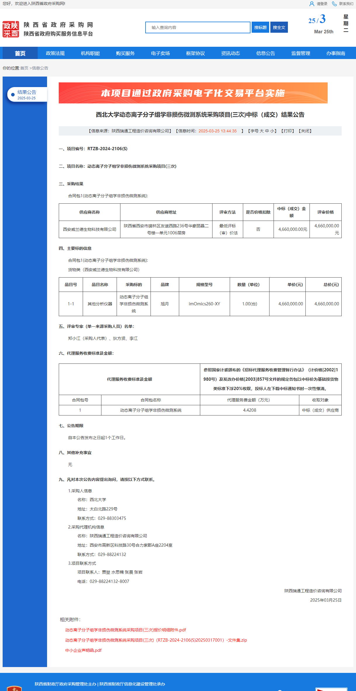 星空app官网动态离子分子组学非损伤微测系统采购项目(三次)中标(成交)结果公告