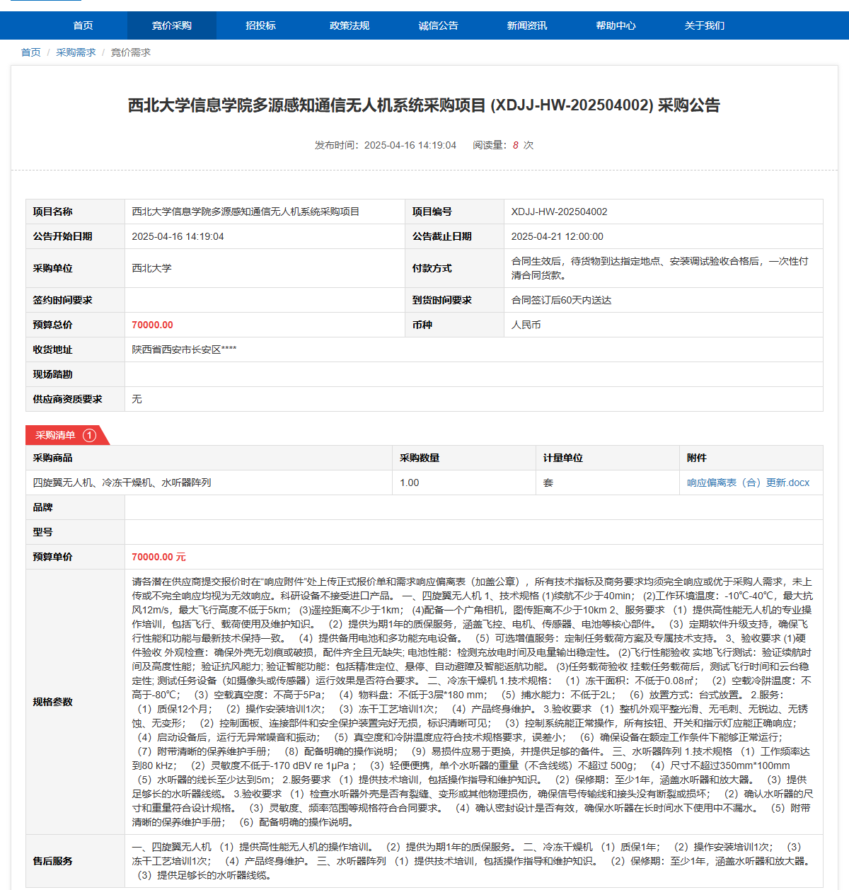 星空app官网信息学院多源感知通信无人机系统采购项目(XDJJ-HW-202504002)竞价采购公告 作者:采购与招标办公室 编辑: 时间:2025-04-16 原公告链接:https://www.ejingcai.com.cn/site/bidding/detail/17703