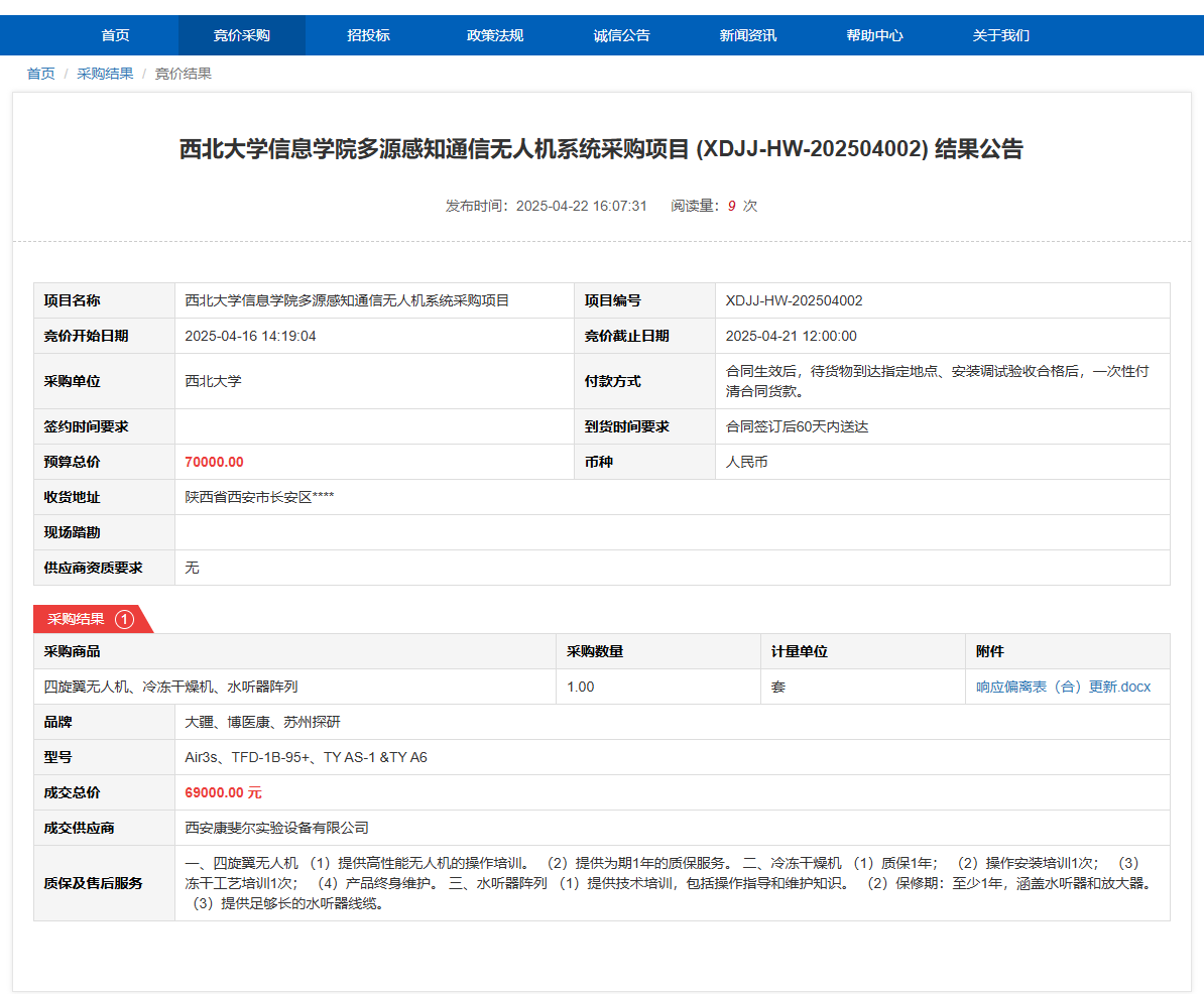 星空app官网信息学院多源感知通信无人机系统采购项目 (XDJJ-HW-202504002) 结果公告 作者:采购与招标办公室 编辑: 时间:2025-04-22 原公告链接:https://www.ejingcai.com.cn/site/bidding/detail/17844