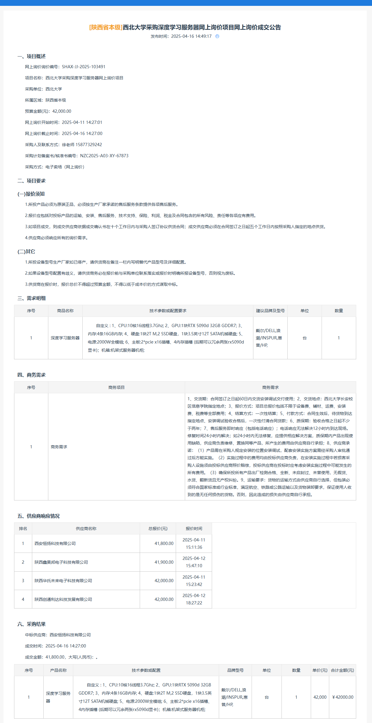 星空app官网采购深度学习服务器网上询价项目网上询价成交公告 作者:采购与招标办公室 编辑: 时间:2025-04-23 原公告链接:https://www.ccgp-shaanxi.gov.cn/gpmall-main-web/basic/noticeDetail?noticeGuid=7311545629157818368