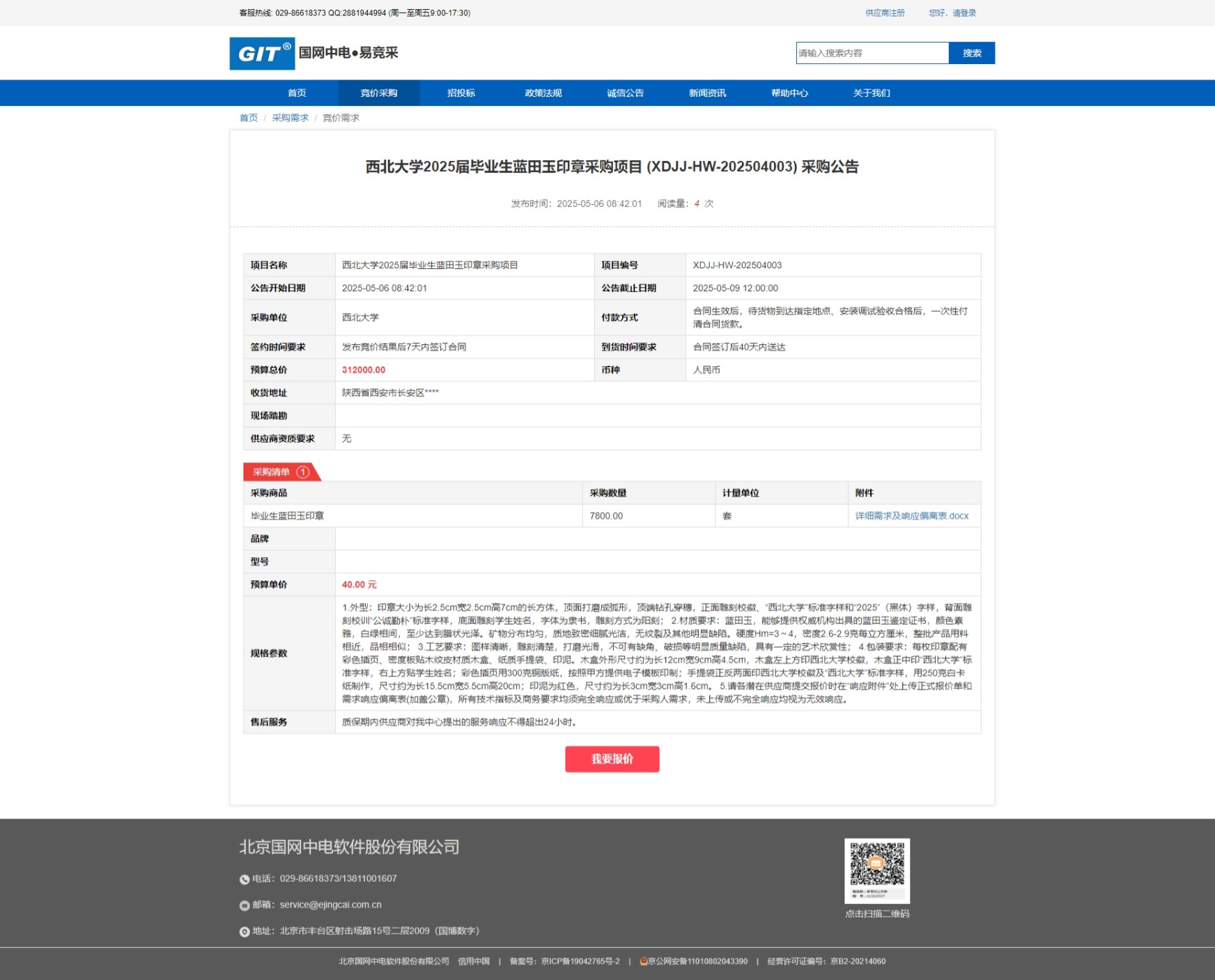 星空app官网2025届毕业生蓝田玉印章采购项目 (XDJJ-HW-202504003) 竞价采购公告 作者: 编辑:采购与招标办公室 时间:2025-05-06 原公告链接:https://www.ejingcai.com.cn/site/bidding/detail/18026