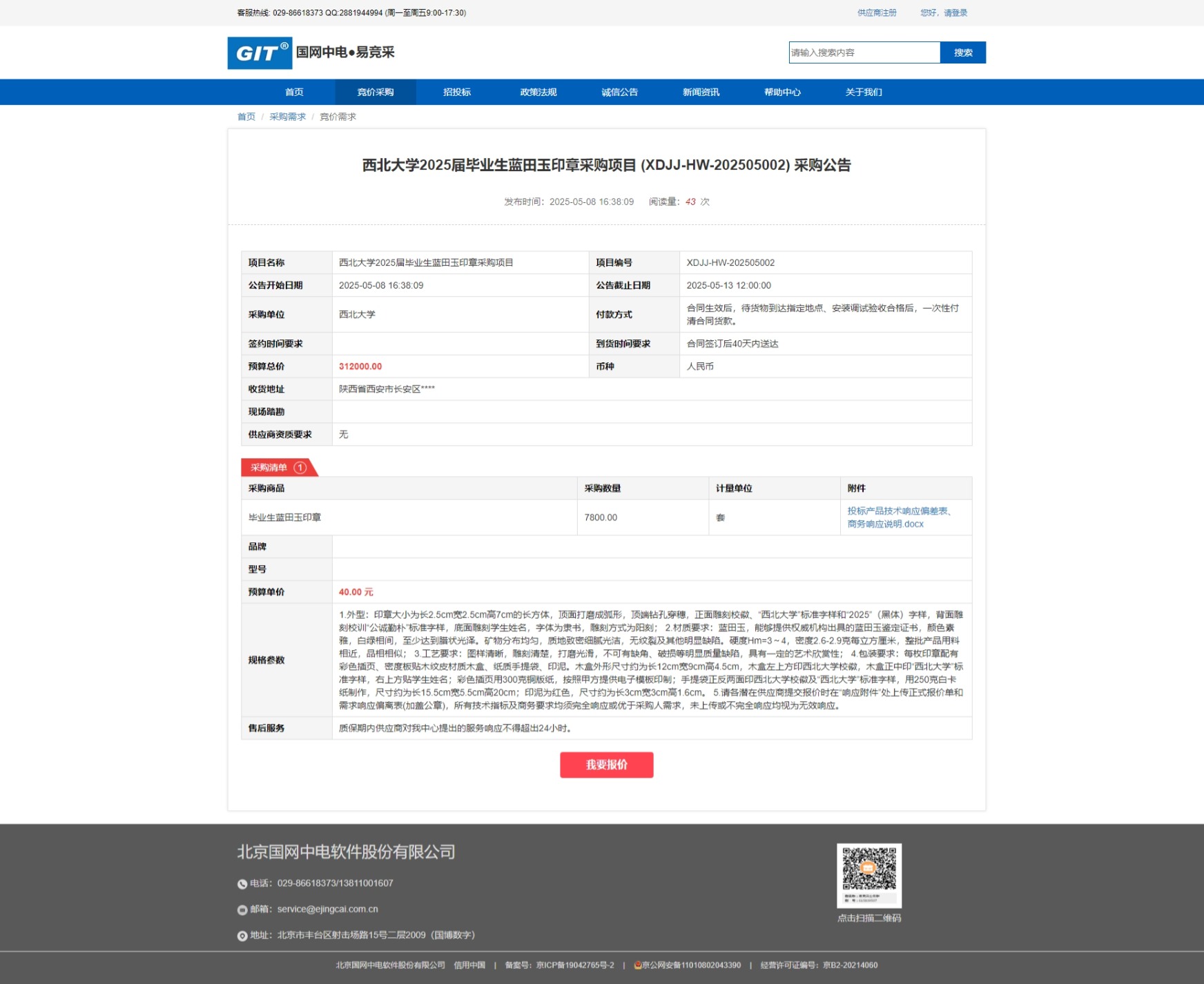 星空app官网2025届毕业生蓝田玉印章采购项目 (XDJJ-HW-202505002) 竞价采购公告 作者: 编辑:采购与招标办公室 时间:2025-05-09 原公告链接:https://www.ejingcai.com.cn/site/bidding/detail/18114