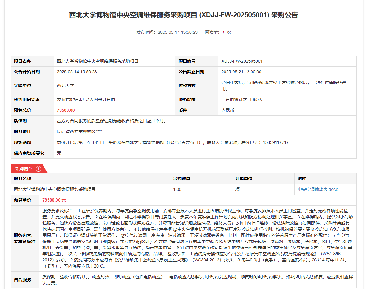 星空app官网博物馆中央空调维保服务采购项目(XDJJ-FW-202505001)竞价采购公告 作者:采购与招标办公室 编辑: 时间:2025-05-14 原公告链接:https://www.ejingcai.com.cn/site/bidding/detail/18217