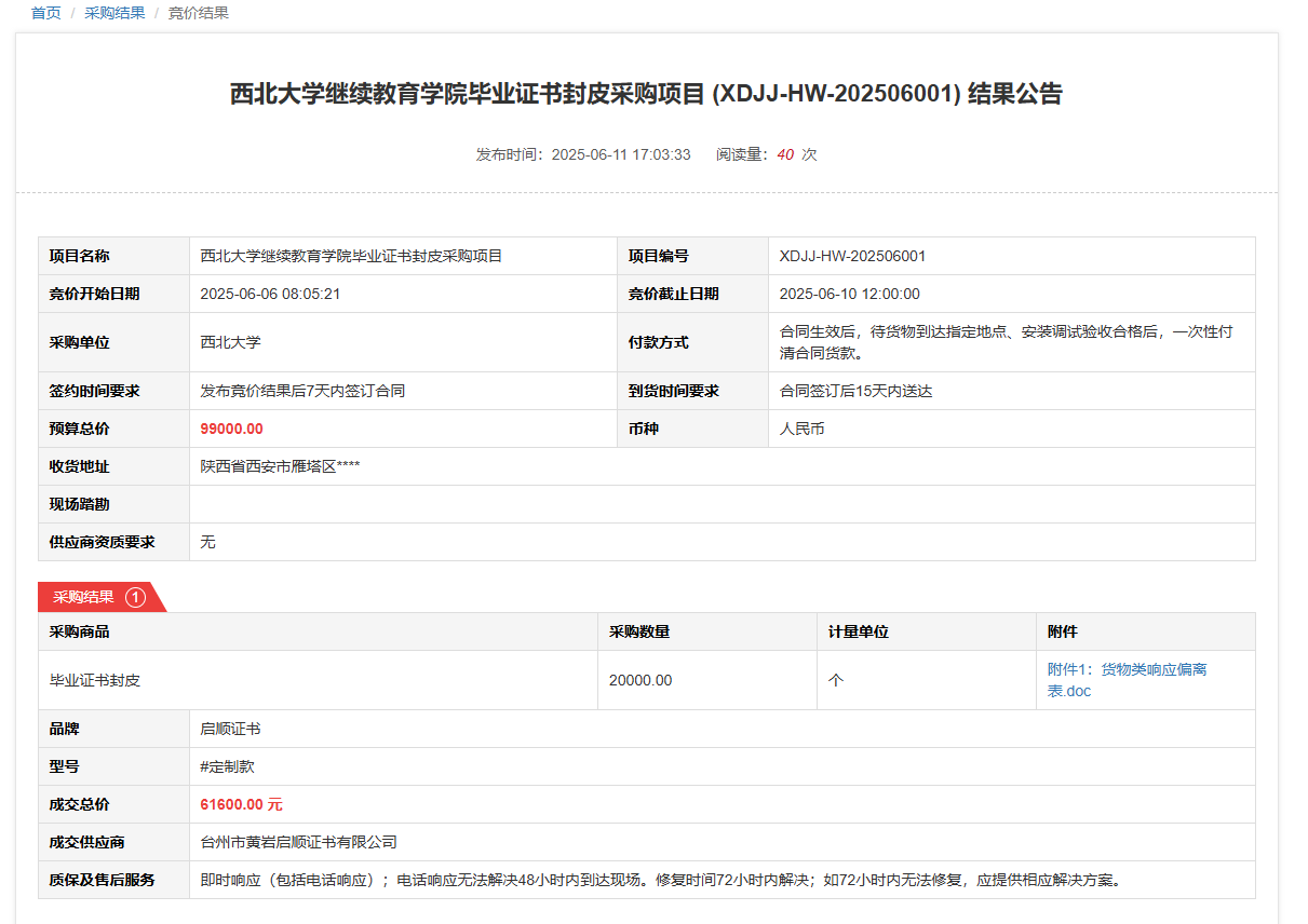 星空app官网继续教育学院毕业证书封皮采购项目(XDJJ-HW-202506001)竞价结果公告 作者:采购与招标办公室 编辑: 时间:2025-06-12 原公告链接:https://www.ejingcai.com.cn/site/bidding/detail/18846