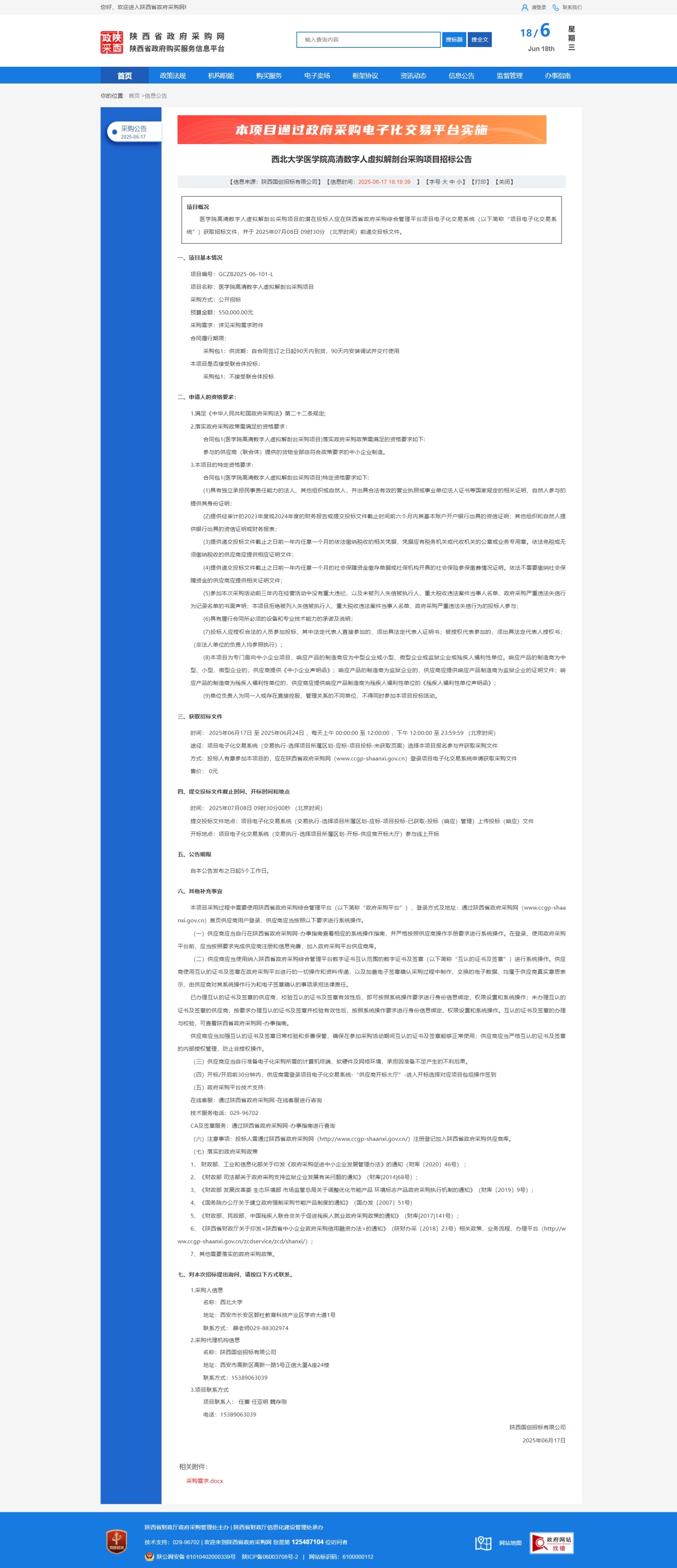 星空app官网医学院高清数字人虚拟解剖台采购项目招标公告 作者: 编辑:采购与招标办公室 时间:2025-06-18 原公告链接:https://www.ccgp-shaanxi.gov.cn/freecms/site/shaanxi/ggxx/info/2025/8a69c0a29672060001977d5b25b77c33.html?noticeType=001011¬iceId=8a96e29e-4b66-11f0-8063-08c0eb20c666