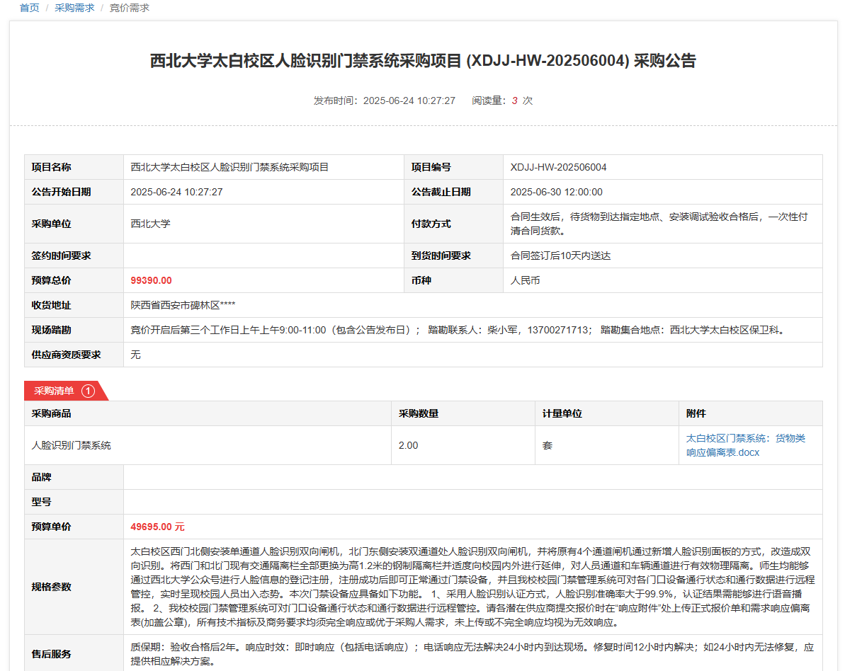 星空app官网太白校区人脸识别门禁系统采购项目(XDJJ-HW-202506004)竞价采购公告 作者: 编辑: 时间:2025-06-24 原公告链接:https://www.ejingcai.com.cn/site/bidding/detail/19128