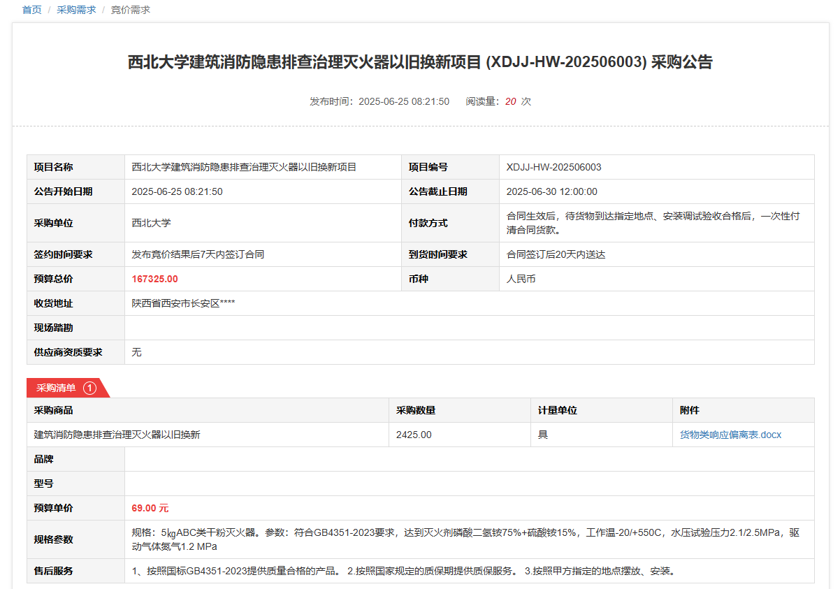 星空app官网建筑消防隐患排查治理灭火器以旧换新项目(XDJJ-HW-202506003)竞价采购公告 作者:采购与招标办公室 编辑: 时间:2025-06-25 原公告链接:https://www.ejingcai.com.cn/site/bidding/detail/19167