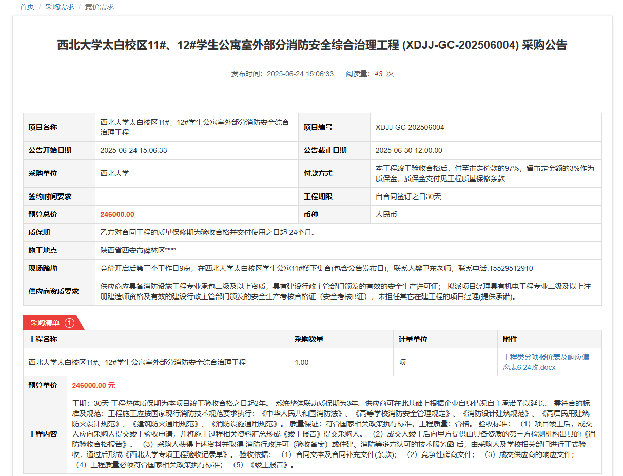 星空app官网太白校区11#、12#学生公寓室外部分消防安全综合治理工程(XDJJ-GC-202506004)竞价采购公告 作者:采购与招标办公室 编辑: 时间:2025-06-25 原公告链接:https://www.ejingcai.com.cn/site/bidding/detail/19136