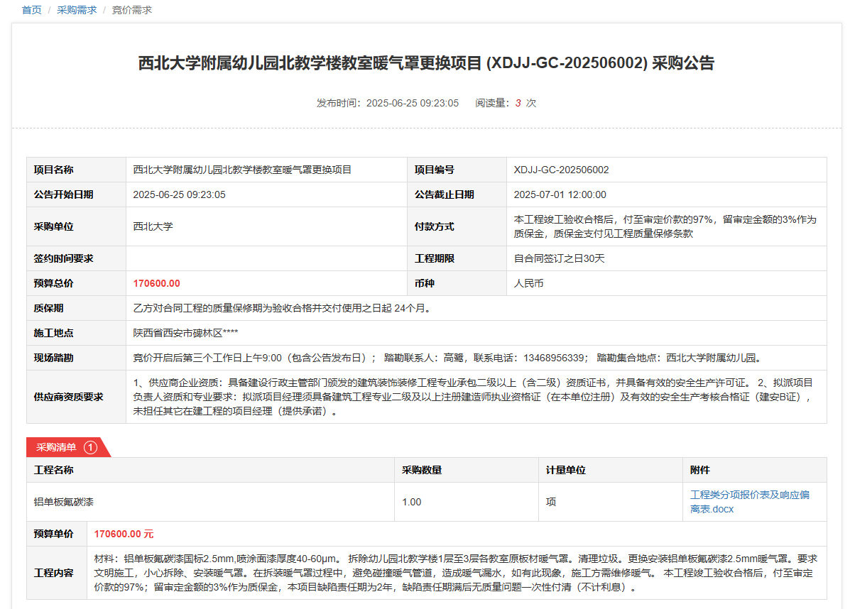 星空app官网附属幼儿园北教学楼教室暖气罩更换项目(XDJJ-GC-202506002)竞价采购公告 作者:采购与招标办公室 编辑: 时间:2025-06-25 原公告链接:https://www.ejingcai.com.cn/site/bidding/detail/19174