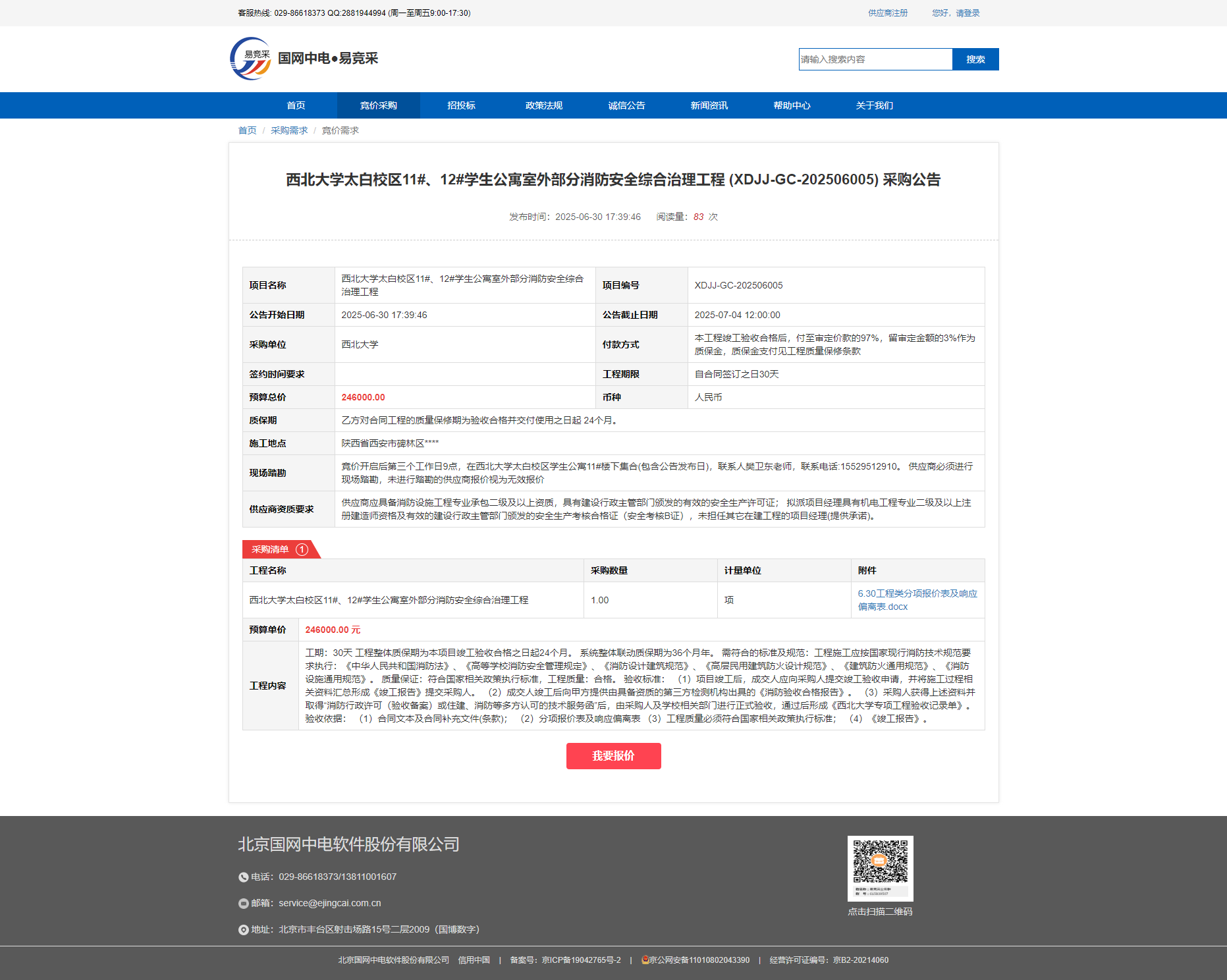 星空app官网太白校区11#、12#学生公寓室外部分消防安全综合治理工程 (XDJJ-GC-202506005) 采购公告