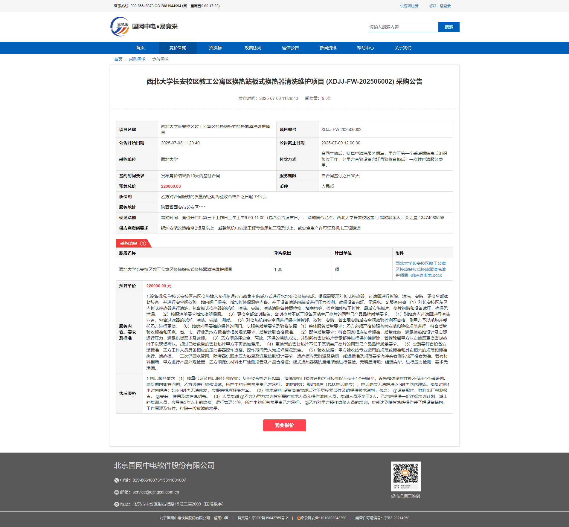 星空app官网长安校区教工公寓区换热站板式换热器清洗维护项目 (XDJJ-FW-202506002) 采购公告